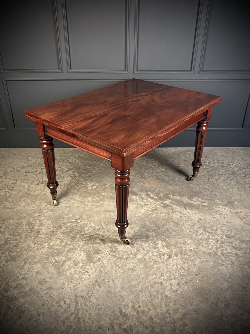 Raised on elegant fluted and turned legs, each terminating in brass cup casters.