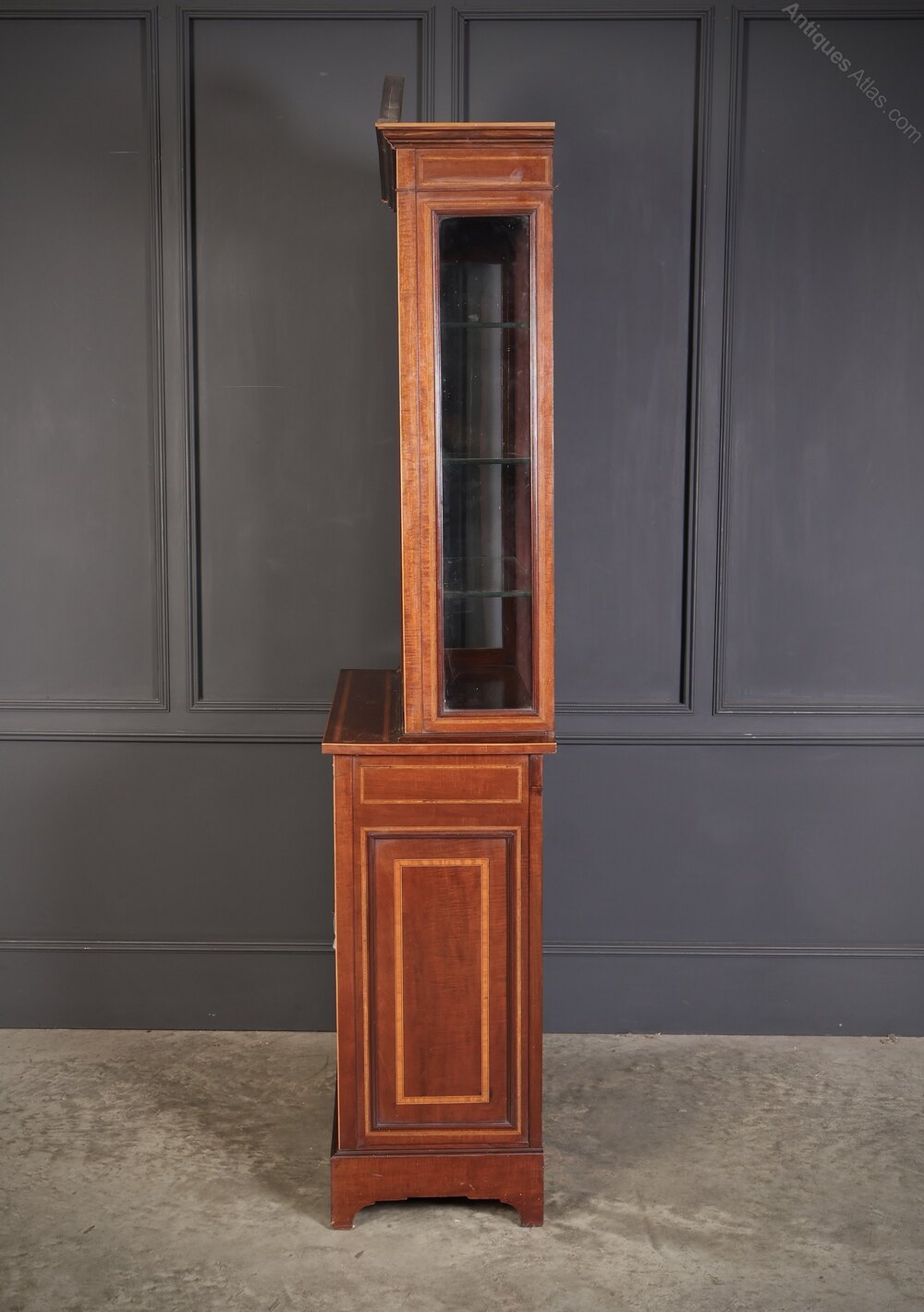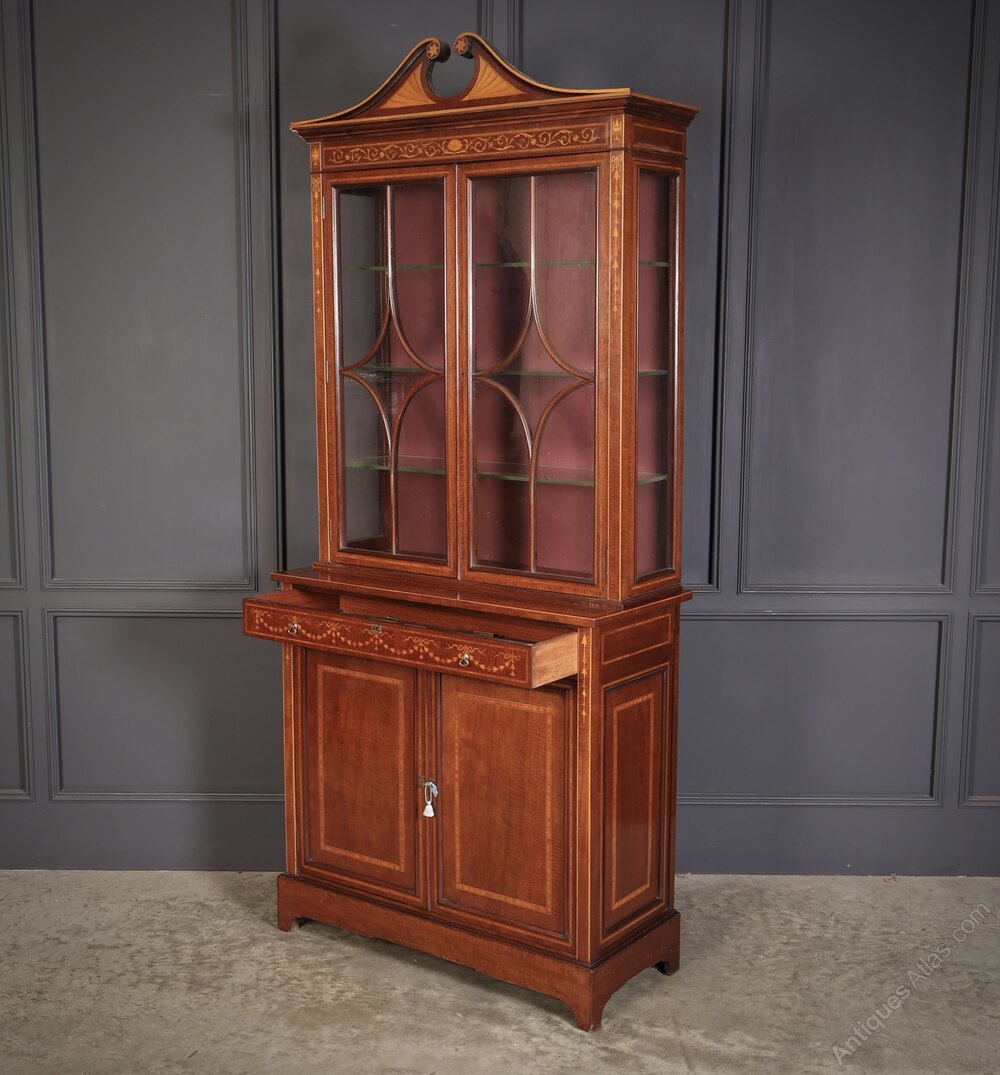 A superb quality two-piece mahogany glazed cabinet, dating to circa 1900.The upper section features a decorative pediment above 2 astragal glazed doors, opening to 3 glass shelves, ideal for display. Below, a beautifully inlaid frieze drawer sits above a pair of panelled cupboard doors, all decorated with delicate marquetry detail. Retaining its original locks and working key.