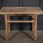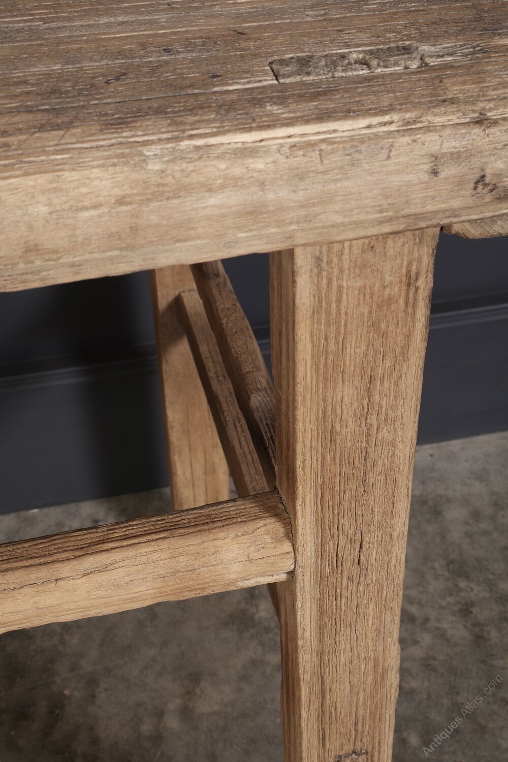 Beautifully worn giving a good indication of its age, this solid elm table has a weathered open grain, lovely light colour and is raised on tall square legs with stretchered supports.