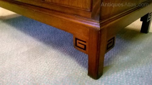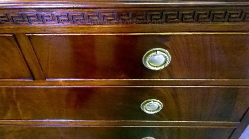 In lovely clean condition this freshly re French polished chest of drawers looks as if it has hardly been used. Really clean inside too. With a look of a chest on stand this early 1900s mahogany two over two chest which boasts its original cabinet furniture is not only good looking but is just a little different. The top rail has a Greek Key design feature as has the leg and the little rear upstand has a Chippendale style blind fret design too.With great colour and impressive graining it is one not to miss.