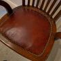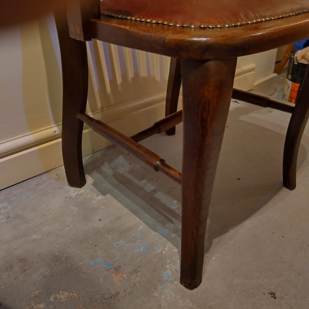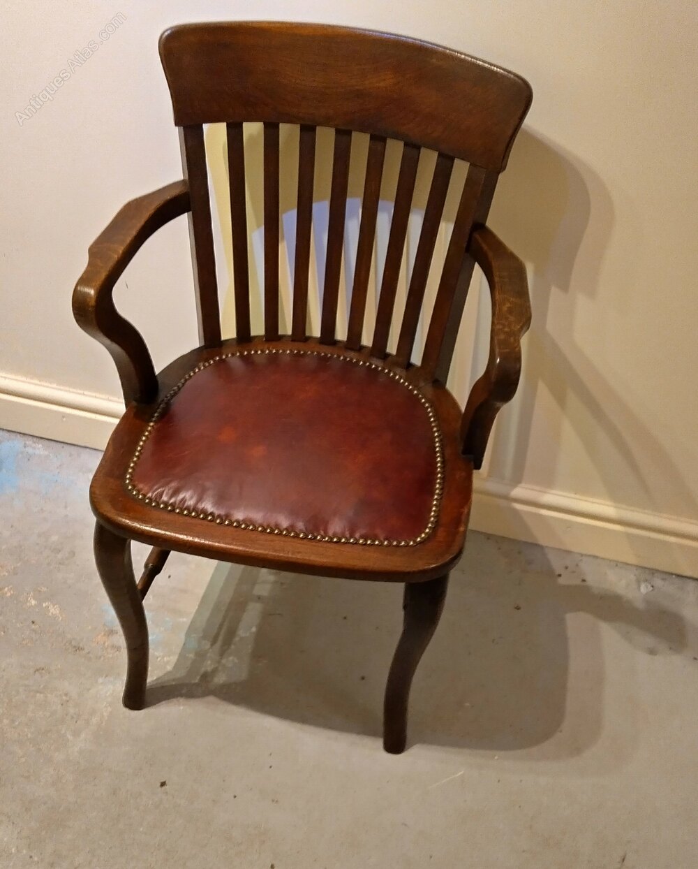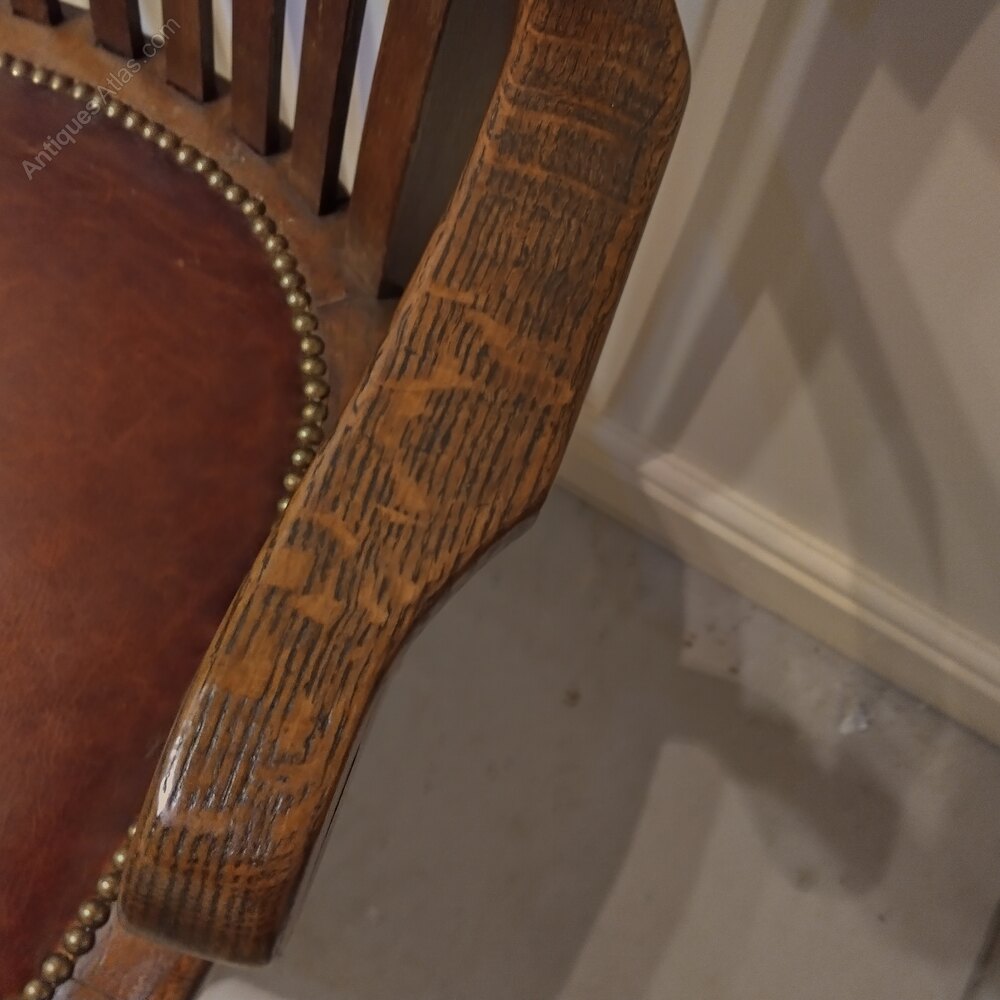 A very useable and sound office chair from the early 1900s by Simpoles, a Manchester cabinet maker and supplier of nice quality furniture from the latter end of the 19th Century. This is in tidy and what seems to be pretty original condition. We have given this a clean and rewaxing in our workshops and it is now ready for a new life. The seat has been recently reupholstered in an antique hide and it has been close studded around the outside. This really adds to the appeal of this open arm desk chair with the cabriole leg and nicely turned stretchers. The well shaped arms display good graining from the quarter sawn oak clearly showing the medullary rays on the arm tops. A sensible price for a good example. Give us a call to discuss 01565 874075.We have been in business for 40 years and are now coming up to retirement. We are in consequence looking to reduce our stock, Delivery can be arranged with a specialist carrier for around £70 to most areas. We now open by appointment, but we are often open Fridays and Saturdays, but cannot guarantee,( our sign will be out if passing ) it is worth ringing before coming.Tel 01565 874075