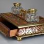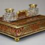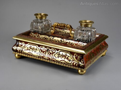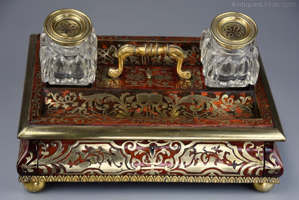 An English mid 19th century (circa 1860) tortoiseshell and inlaid brass desk stand or inkstand in the Napoleon III style.This piece consists of a tortoiseshell desk stand with intricate foliate Boulle decoration of engraved brass inlaid into a red tortoiseshell ground, the decoration to the top, sides and back.