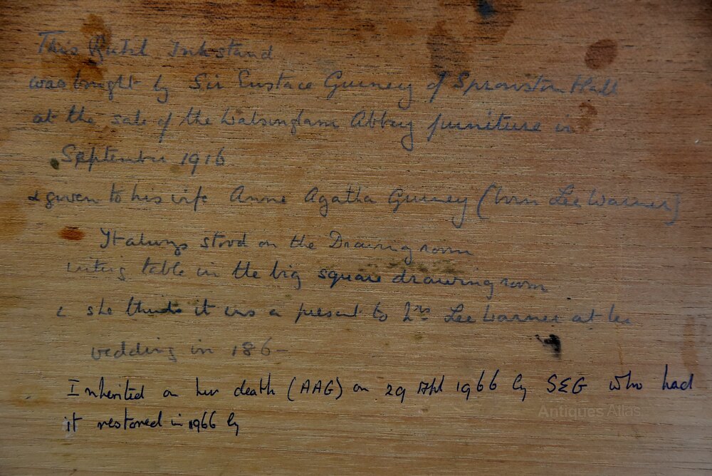 We have found an interesting handwritten inscription to the underneath of the drawer stating the inkwell was 'purchased by Sir Eustace Gurney (1886-1927) of Sprowston Hall in 1916 at the Walsingham Abbey furniture sale in 1916 and given to his wife Anne Agatha Gurney' and that it always 'stood on the Drawing Room writing table in the big square drawing room'.