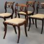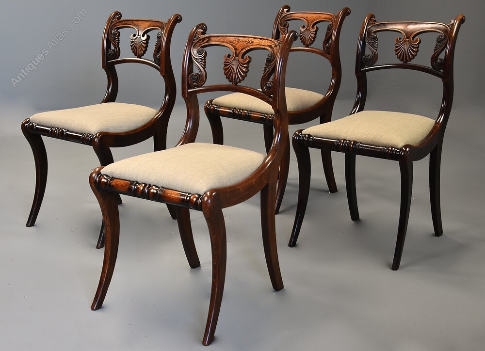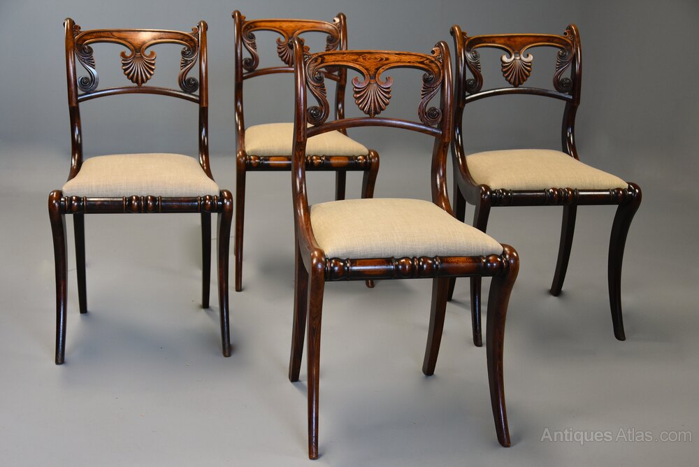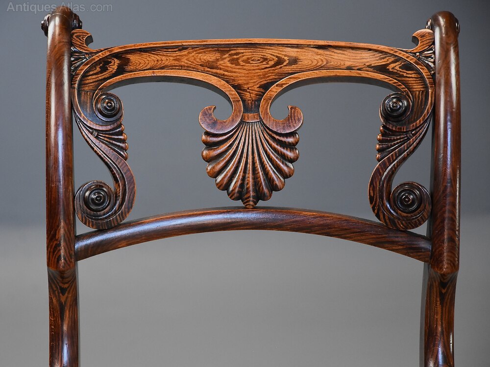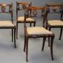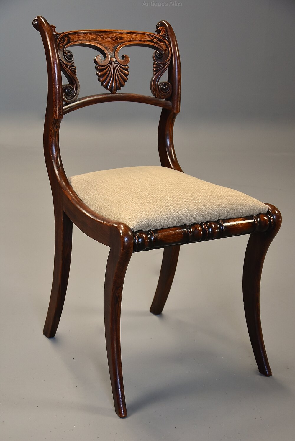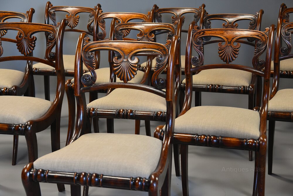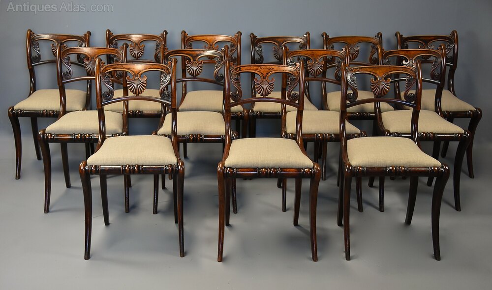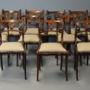 A fine quality set of thirteen early 19th century Regency (circa 1815) simulated rosewood dining chairs with good, original colour.This set of chairs of simulated rosewood on beech consist of a shaped top rail with finely carved central anthemion design with shaped and carved scrolling decoration to either side with turned paterae and a shaped back support.
