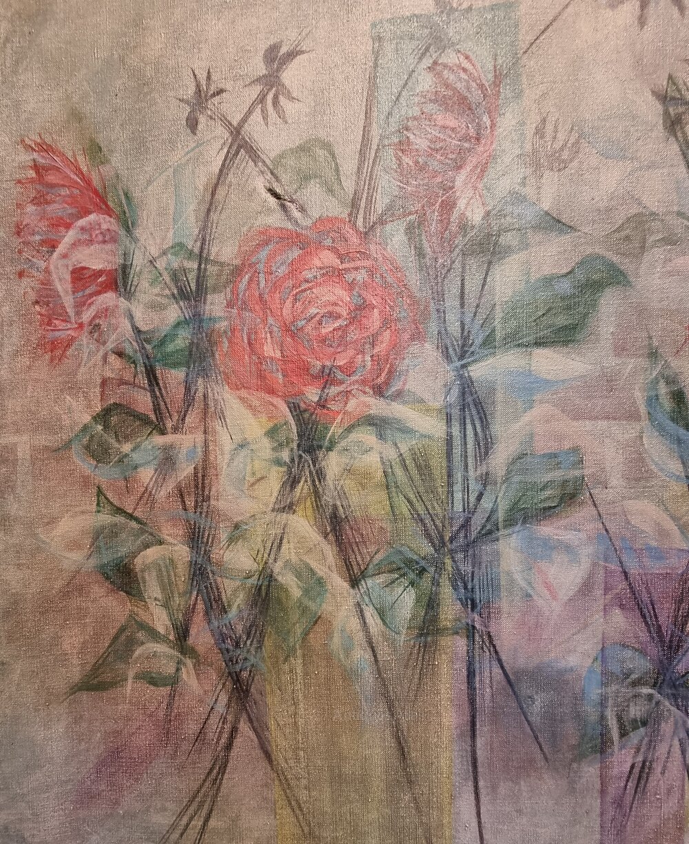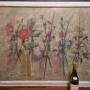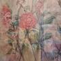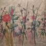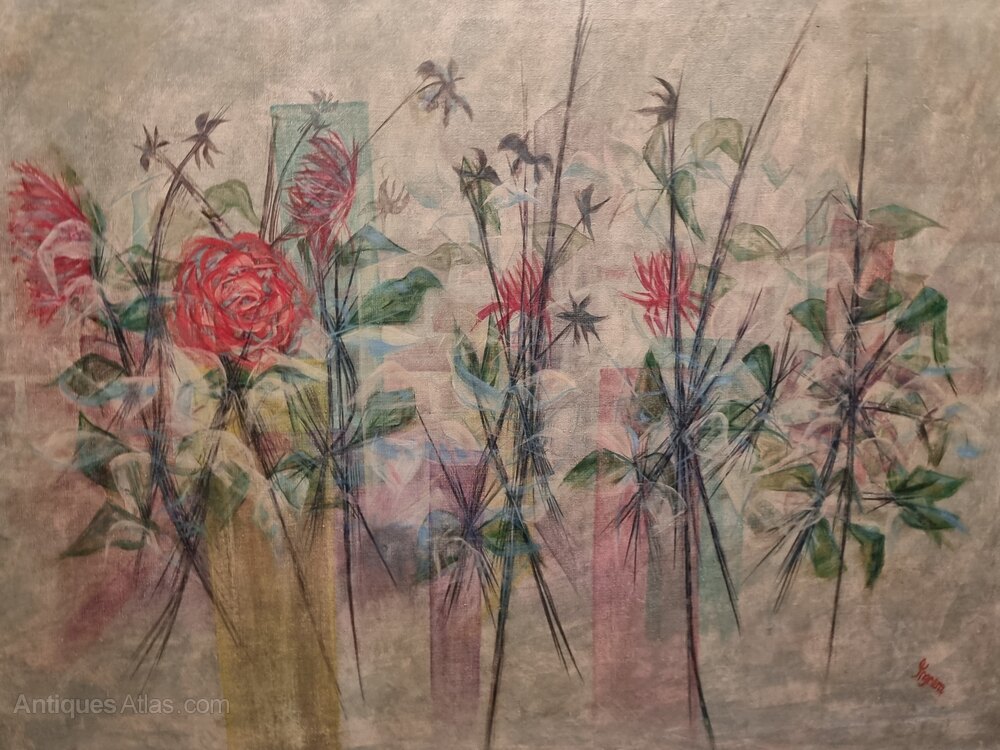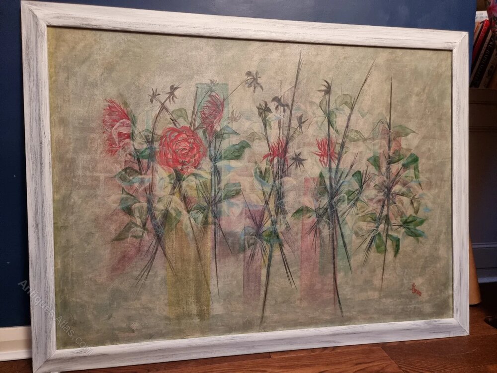 A really large painting on canvas, signed Ingram, framed in a modern white distressed painted wood frame. The subject is of various flowers and stems, this would be a wonderful interiors or decorating piece and is in fine condition as having been stretched and reframed.Measures 92cm high by 122cm wide