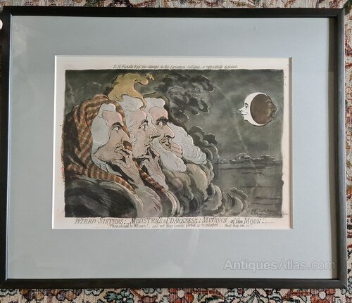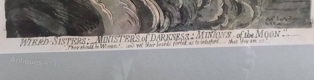 Weird Sisters "Ministers of Darkness, Minions of the Moon" by Gilray. Unusual print, originally published by Humphrey's 1791 (possible re-strike).Newly re-framed, a wonderful interiors wall hanging.