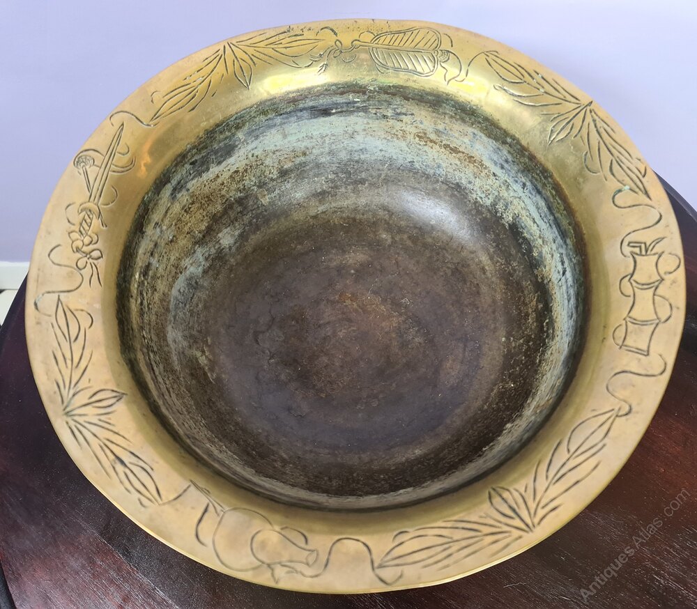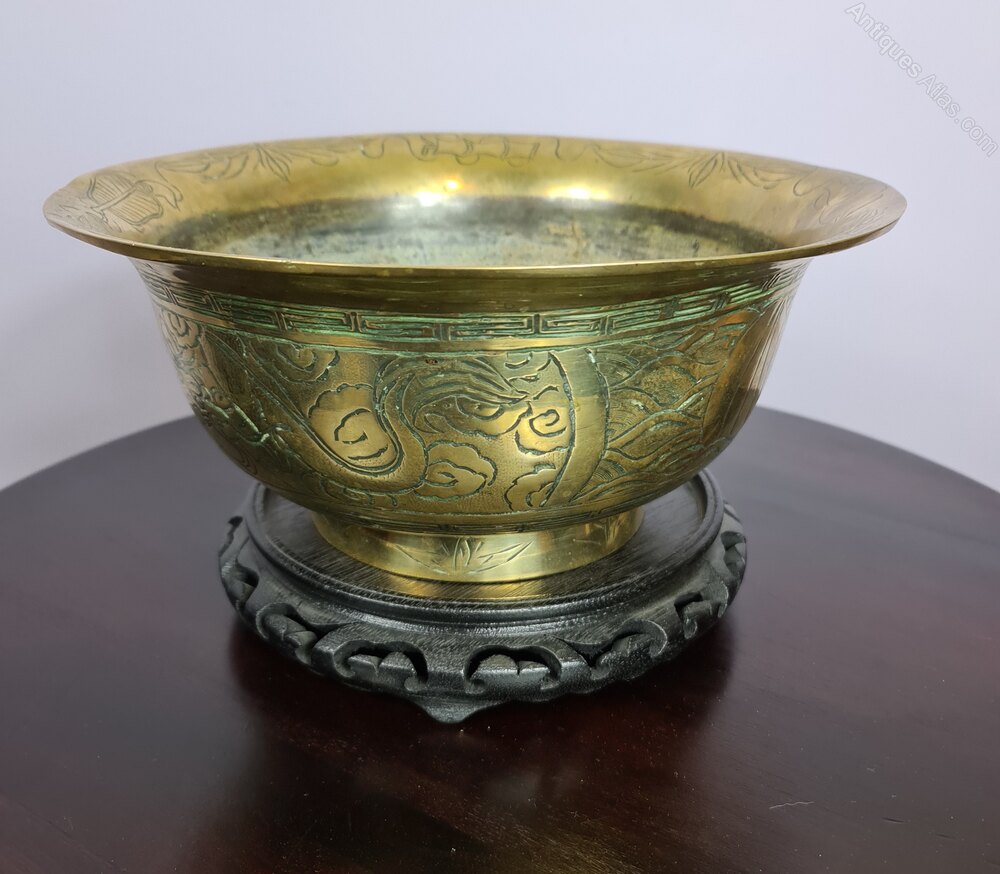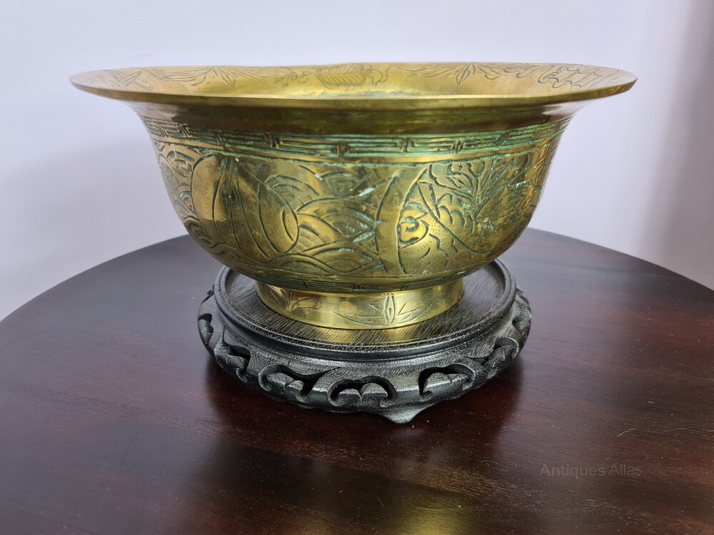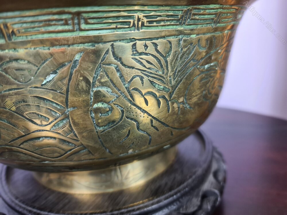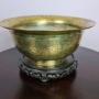A large Chinese Brass Bowl with various engraved patterns to the outer side and rim, very good condition. It is shown sitting on a stand which is associated and not original to the piece and does not come with it.Dimensions:
