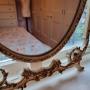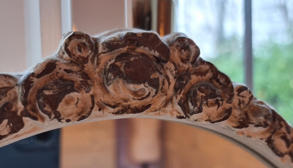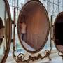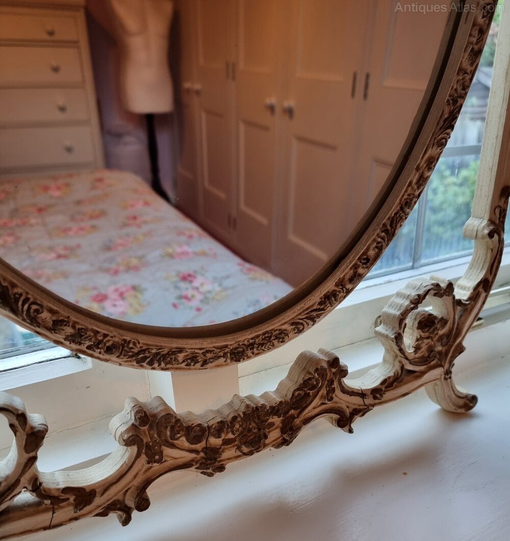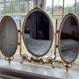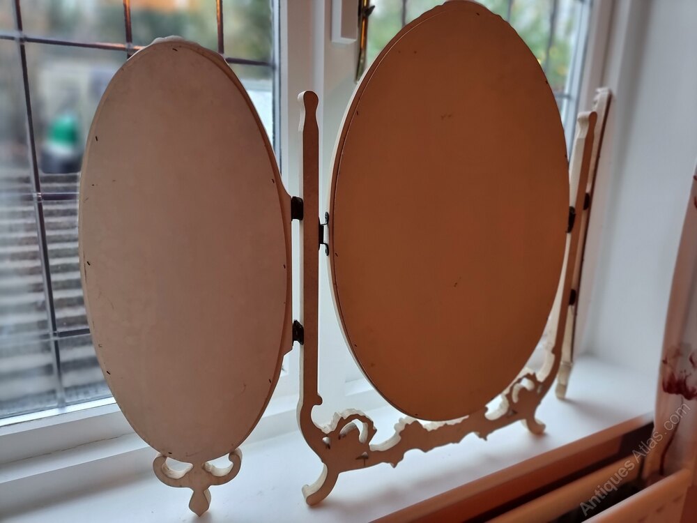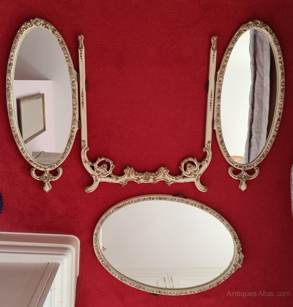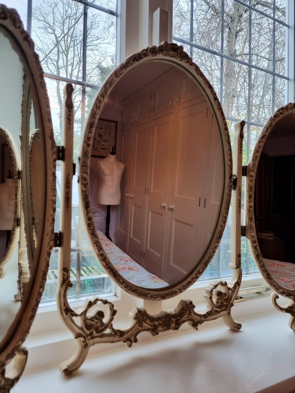 This is an attractive dressing table mirror with a gilt pattern over a cream base. Normal wear and tear for a near 100 year old mirror. Would work in any stylish bedroom or similar.Height 62cm Main centre mirror 37cm wide and side mirrors 22cm wide. Total width when extended 80cm