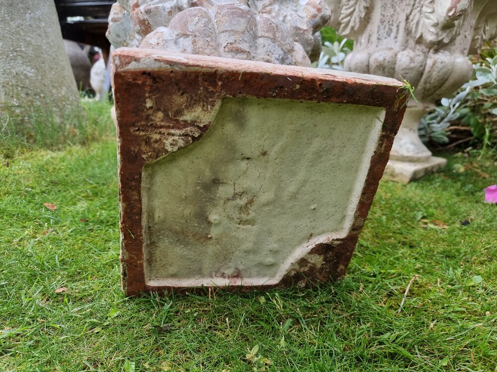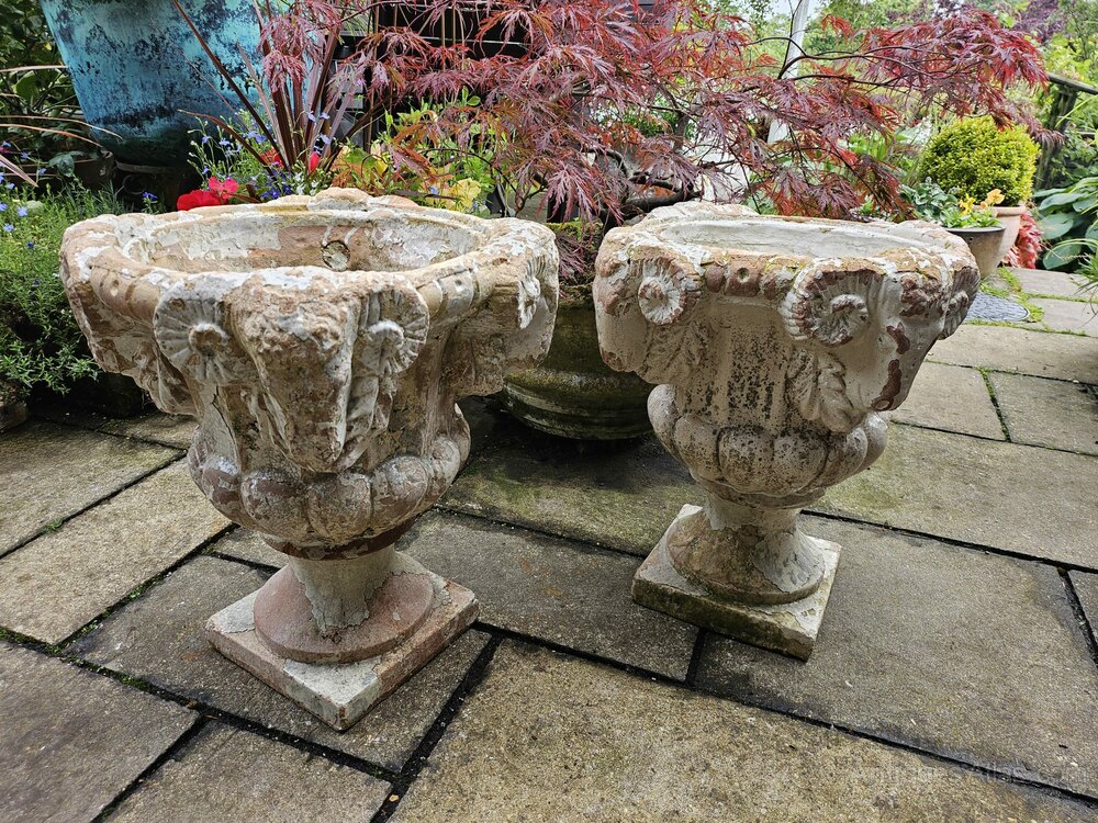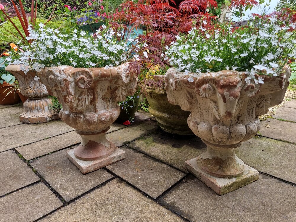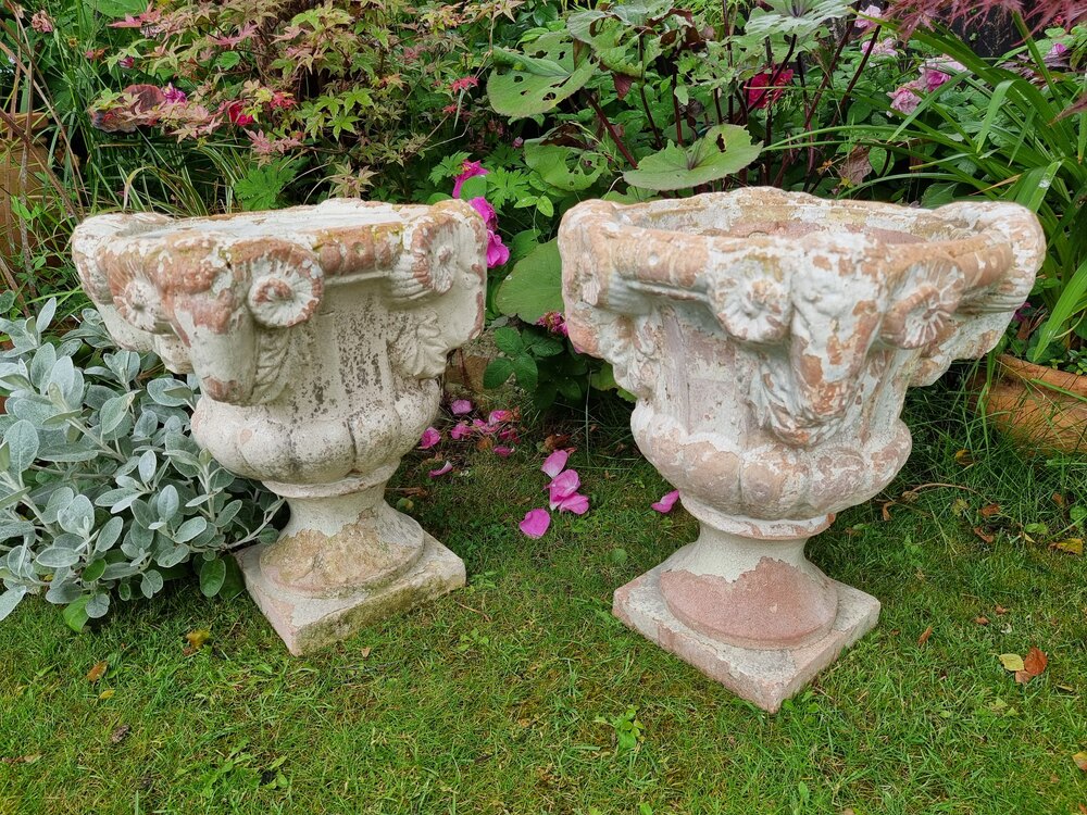 Handsome heavy pair of Ram’s Head terracotta urns, completely sound with normal wear and tear over a crackle glazed coating (see photographs).These are possibly from the early 19th Century Regency period. A stylish look for your patio or entrance, and a rare pair.