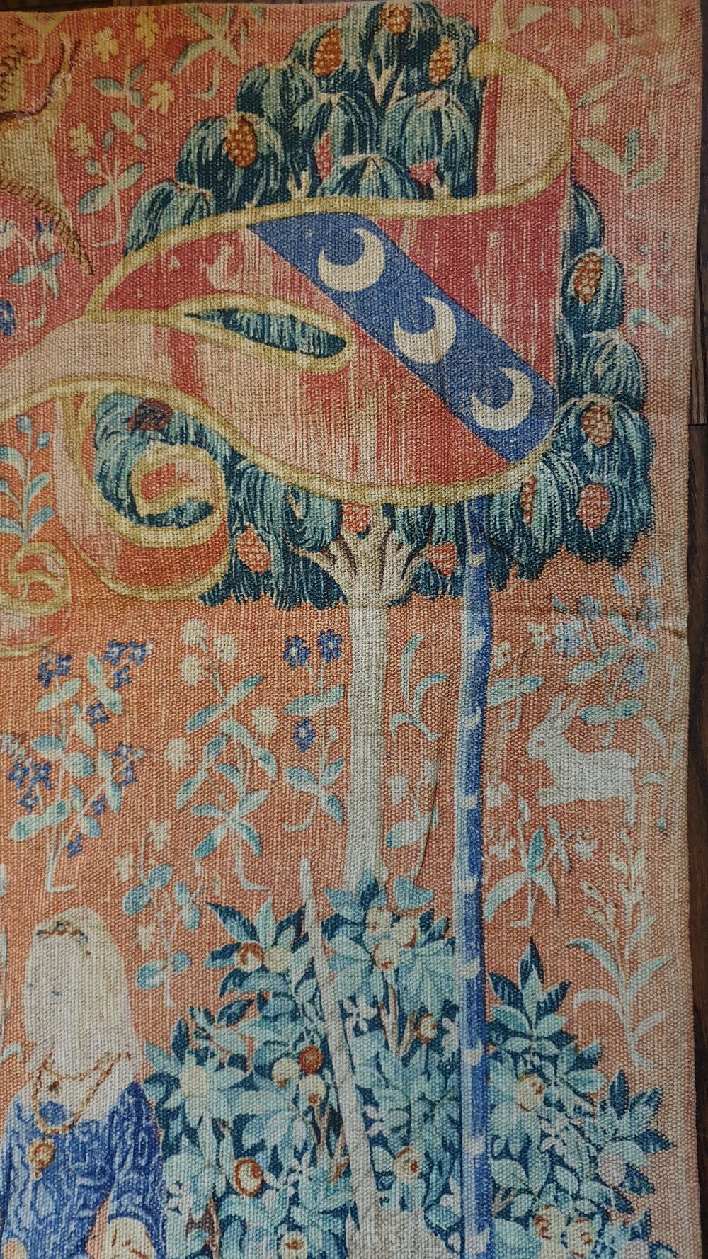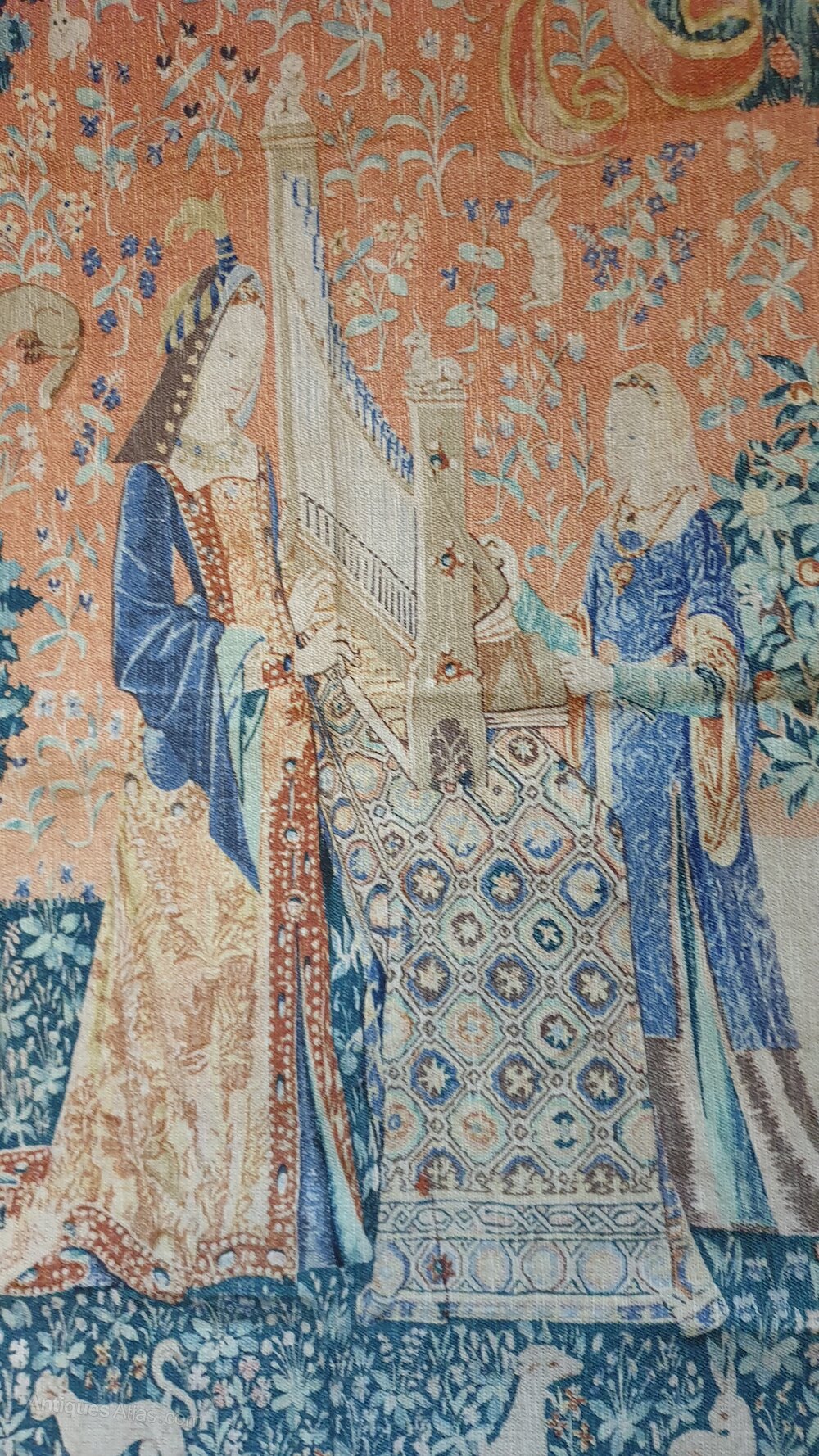 REDUCED...Retirement Sale!...REDUCEDA French printed wall hanging tapestry, harp playing noblewoman. Wonderful faded colours but in great condition, an excellent and interesting interiors piece.