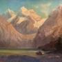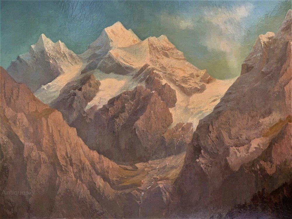 This is a magnificent large scale oil painting on canvas, the mountains in fabulous detail.