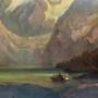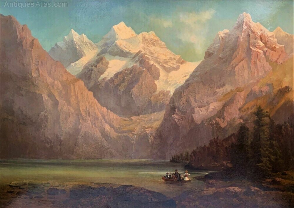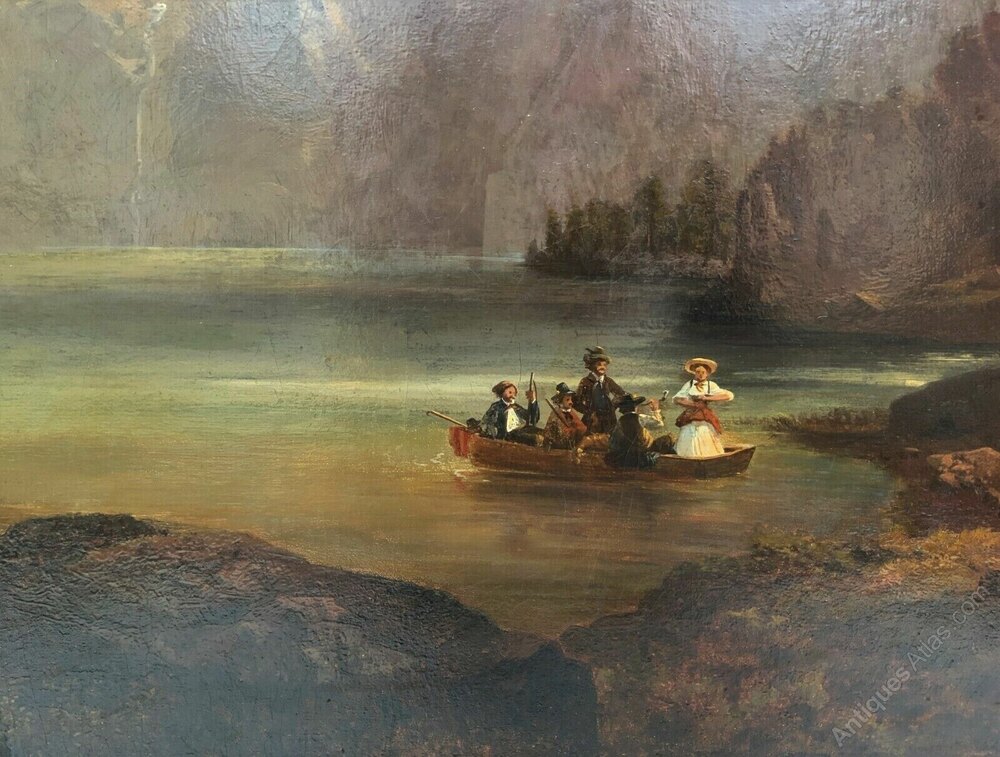19th Century Austrian Alpine Mountainous Landscape Oil Painting Depicting Lake & Boat