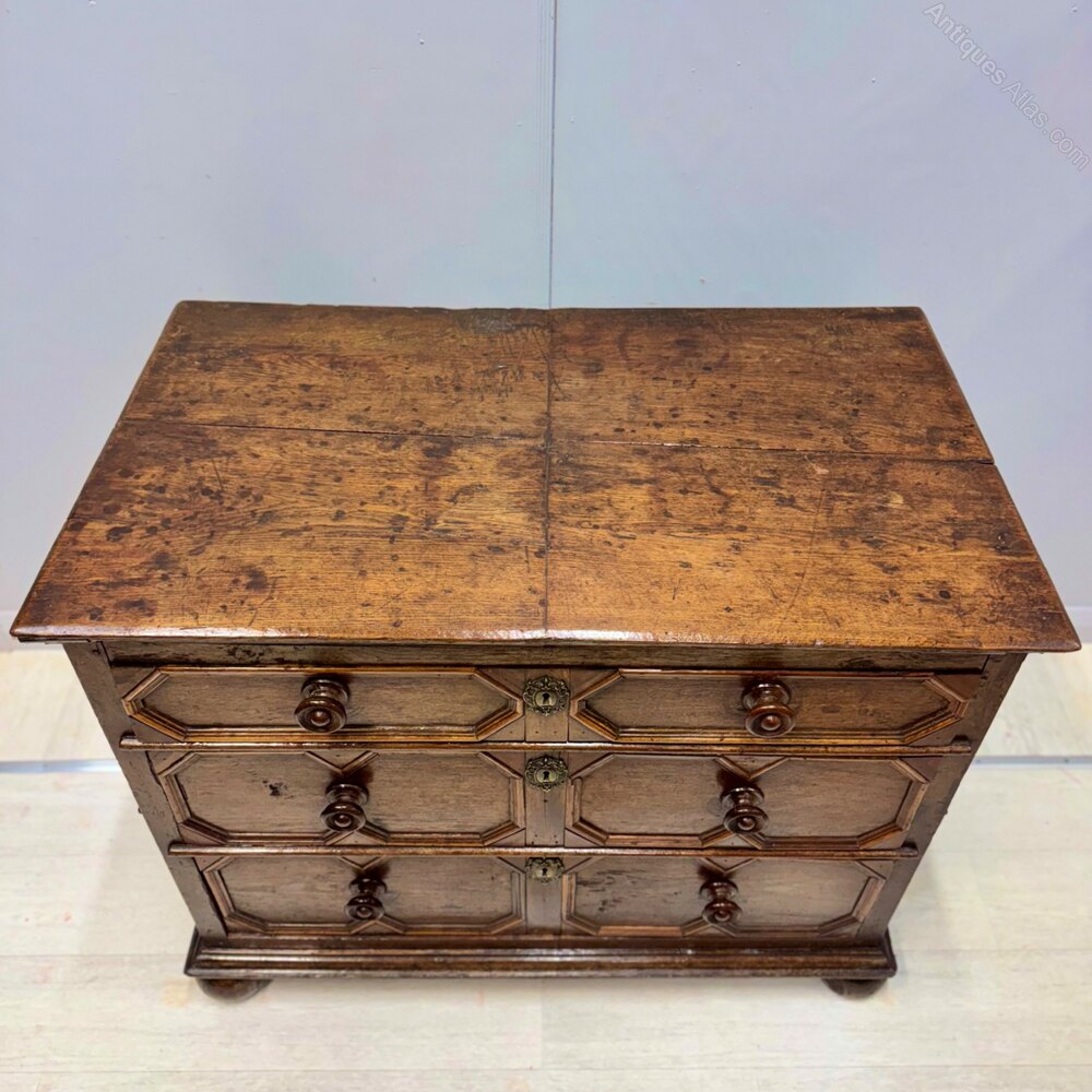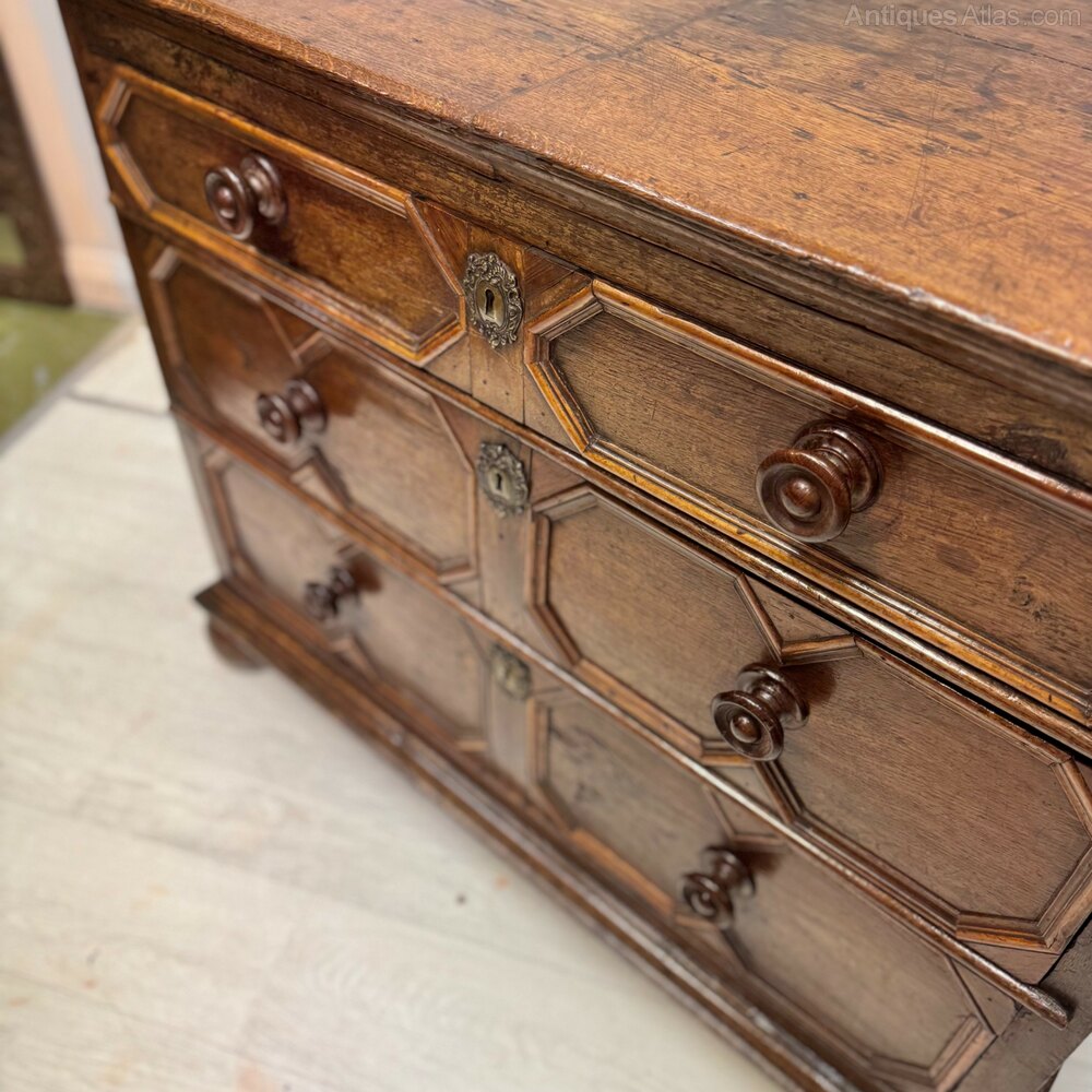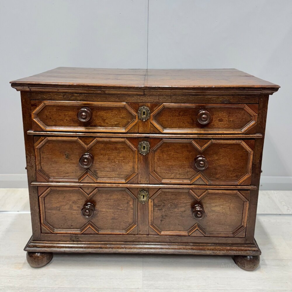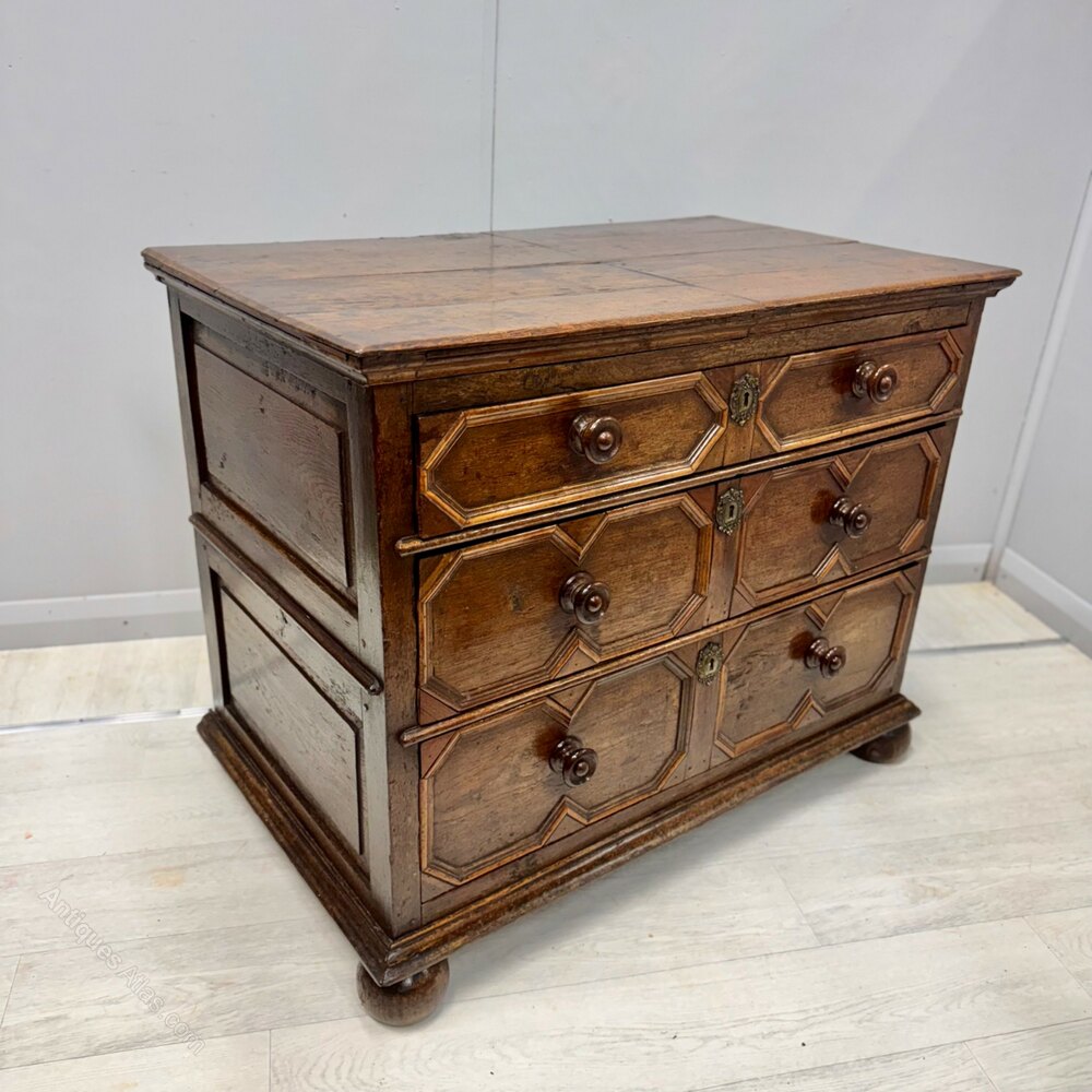 Fine Country House 17th Century Oak Geometric Chest Of DrawersBeautifully hand crafted centuries ago from seasoned cuts of oak presenting a fabulous looking piece of antique bedroom furniture, known as a geometric chest of drawers, with heavy panelled solid sides and displaying a rich and wonderful patina throughout, aged piece full of country house character, standing on turned bun feet to front ,planked wooden panels to back
