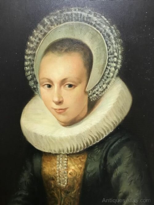 She wears a wedding ring on her left index finger. The type of diadem cap was worn by married woman and the vlieger (the loose fitting cape) was entirely reserved for married woman.