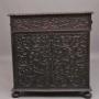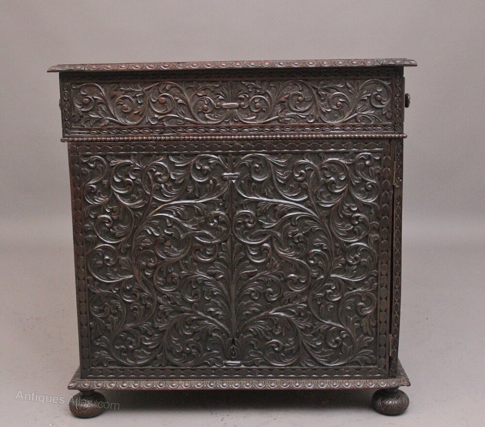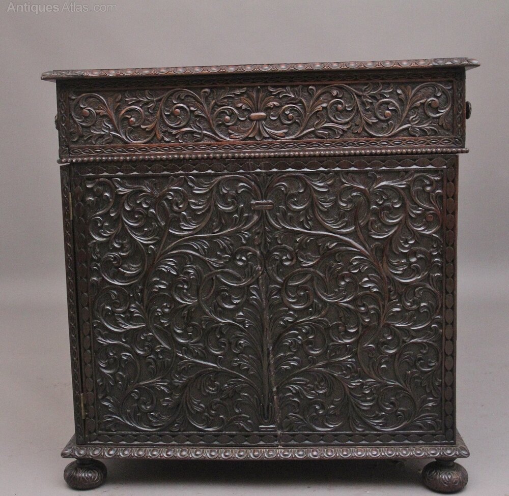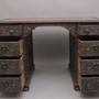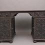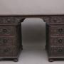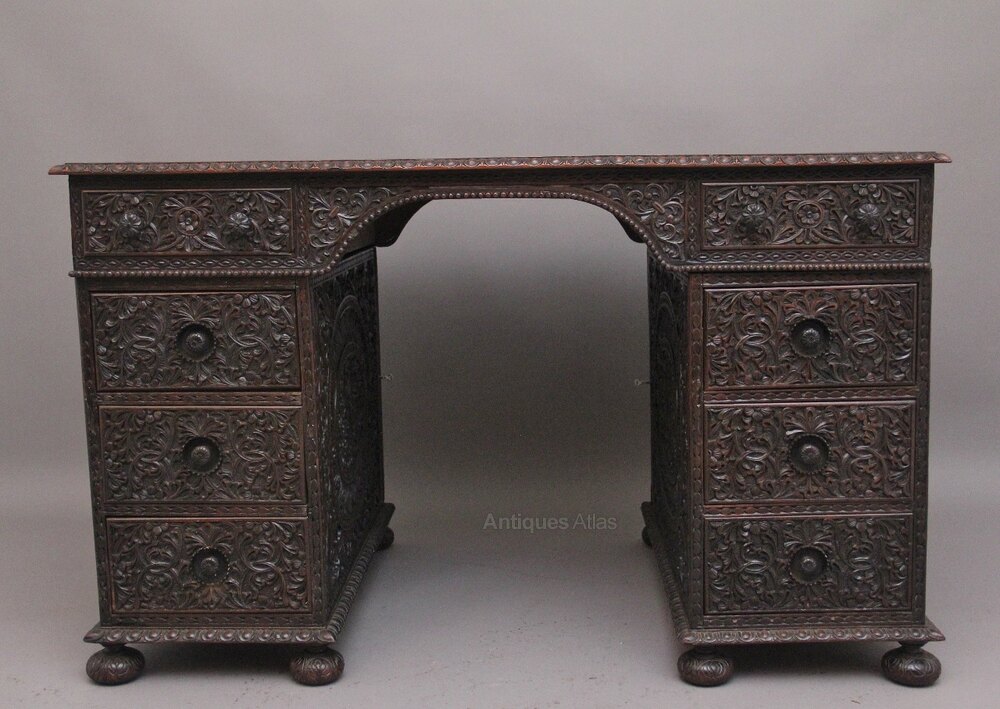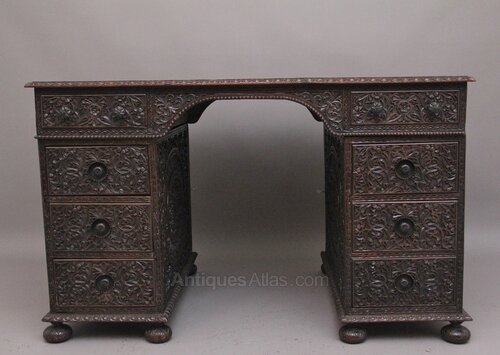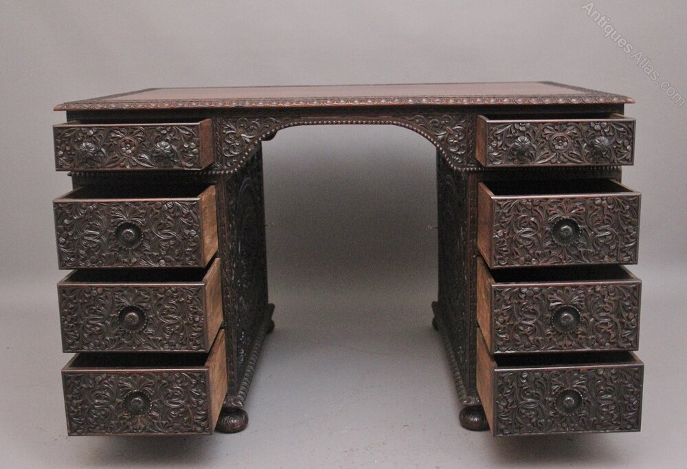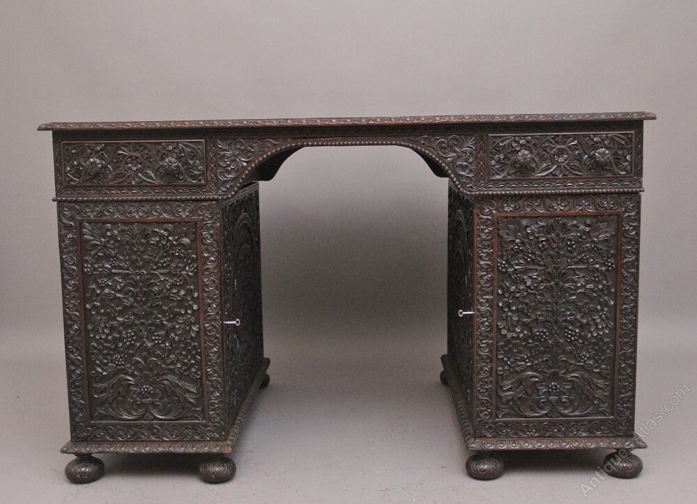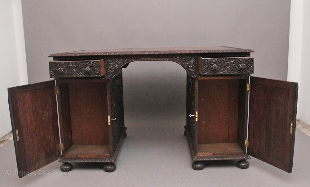 A lovely quality early 19th Century Anglo-Indian carved padauk partners desk, having a nice figured top with an ornate carved border and gadrooned edge, a selection of eight graduated drawers below with the original carved wooden knob handles and having carved floral decoration on the drawer fronts, with a decorative caved central arch, the reverse of the desk in the same style as the front but having a drawers on either side with a cupboard below, the sides of the desk profusely carved in the same style as the front and back of the desk, raised on carved turned feet. Circa 1840.51 3/4" x 31" x 32" high