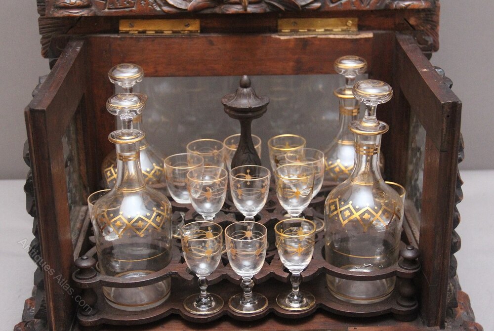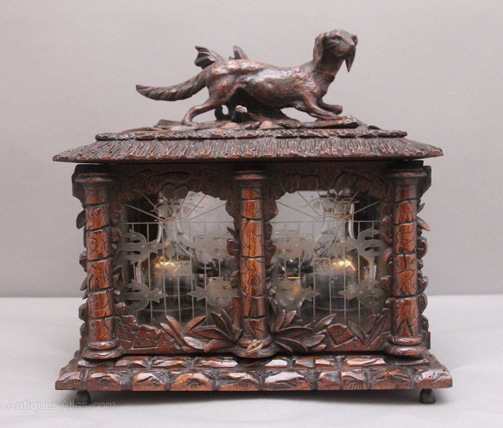A superb quality 19th Century black forest walnut "Cave a' Liqueur" drinks cabinet, the shaped platform top having a dog sitting amongst various foliage, the cabinet profusely carved all over and incorporating engraved glass arched panels to the sides and front with engraved glass to the rear, decorative turned columns at the front with a lockable key in the central column, raised on a carved platform base with turned feet, the hinged lid lifts upward and then falls back allowing the front to be open for ease of access, comprising of four decanters and 15 liqueur glasses (originally 16) each glass etched in gold. Wonderful quality and in excellent condition. Circa 1880.16 1/4" x 12" x 16 3/4" high (total height)