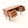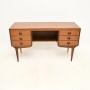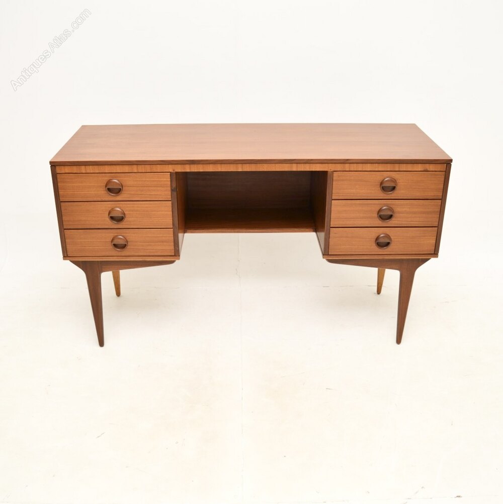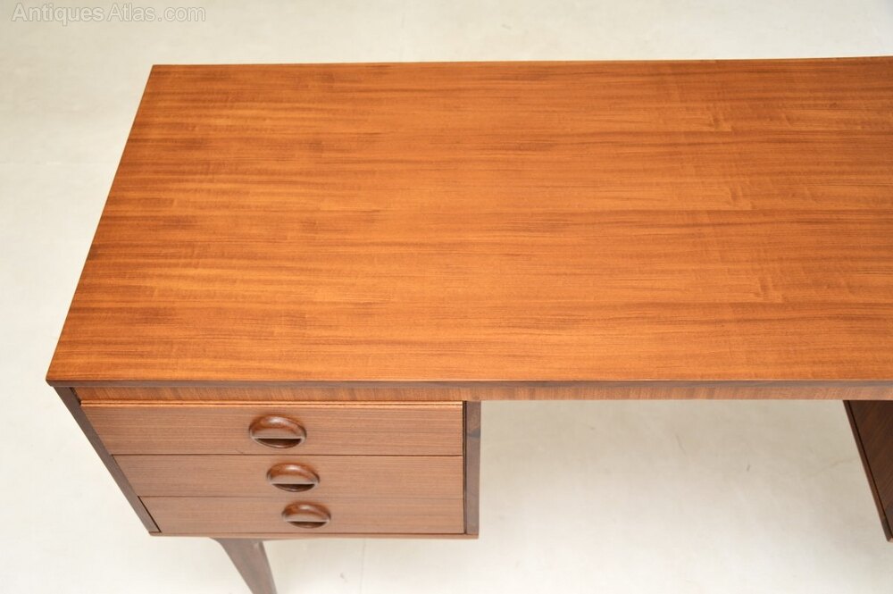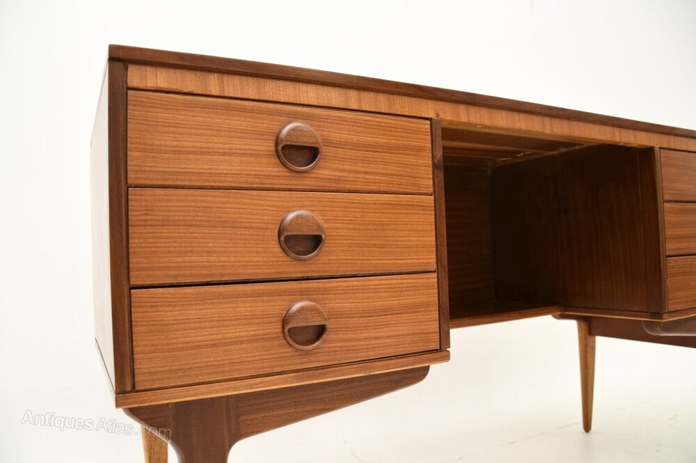 A stylish and very practical vintage walnut desk, made in England and dating from the 1960’s.The quality is superb, this is beautifully designed with lovely round sculptural handles and stylish tapered legs. The walnut has a beautiful colour tone and striking grain patterns. This is a very useful size with a good amount of work space, the top is not too deep front to back, so it is not too imposing.