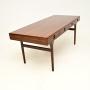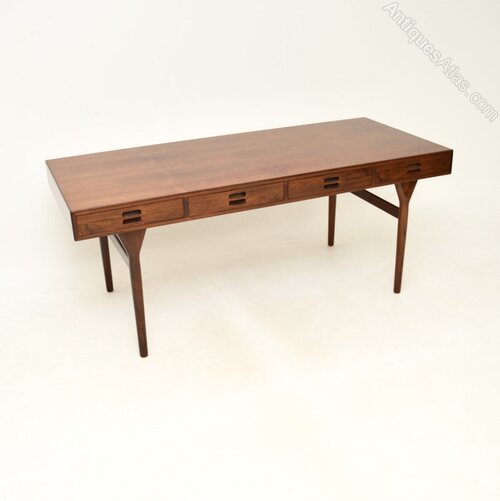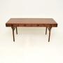 An extremely stylish and iconic Danish vintage rosewood desk by Nanna Ditzel for Soren Willadsen. Originally designed in 1955, this dates from the 1960’s.It is of outstanding quality, it is an impressive and useful size. There are four drawers in the front with beautifully sculpted handles, this stands on wonderful tapered legs. The back is also nicely finished, so this can be used as a free standing item.