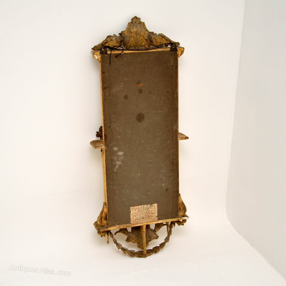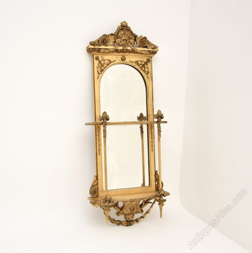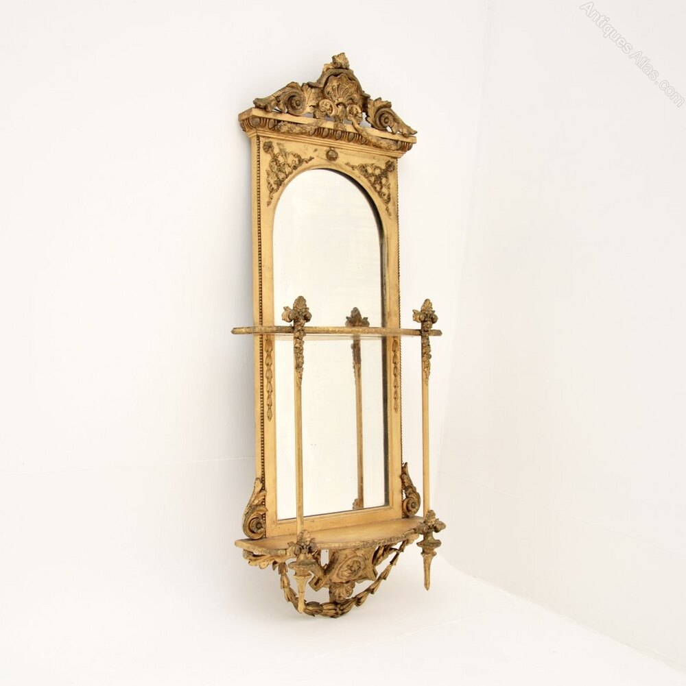An absolutely stunning antique Victorian period gilt wood mirror. This was made in England, it dates from around the 1840-1850 period.It is of incredibly fine quality, it is nice and slim with two built in shelves. There are lots of fine details all over, this is a combination of gilt wood and gesso. The gilt finish has a gorgeous patina, there is a makers label on the back which reads: W. Fetherstone.