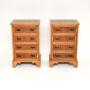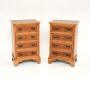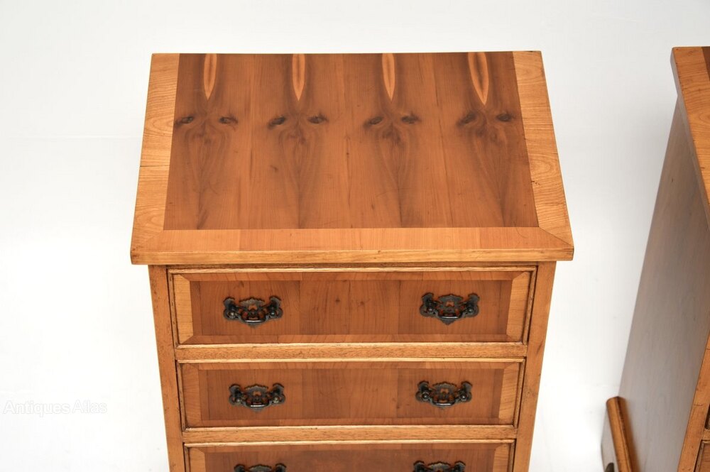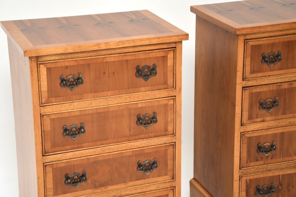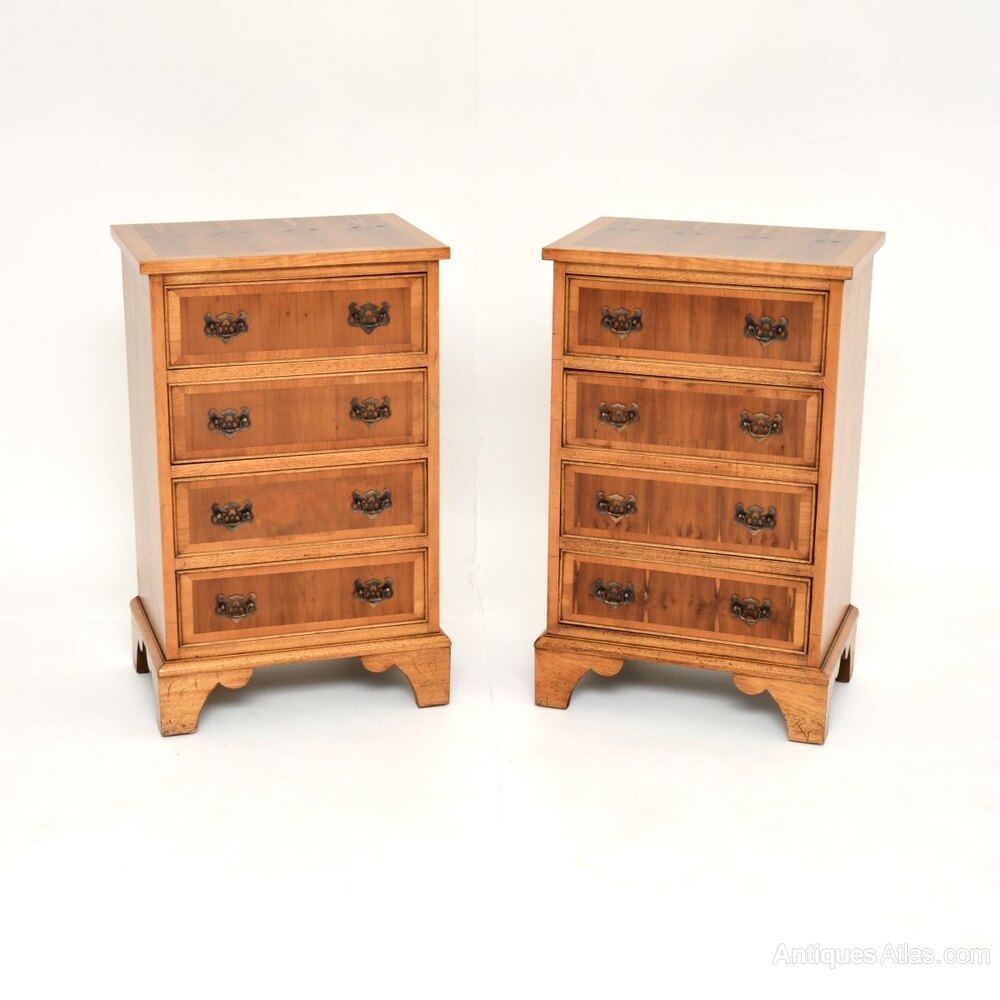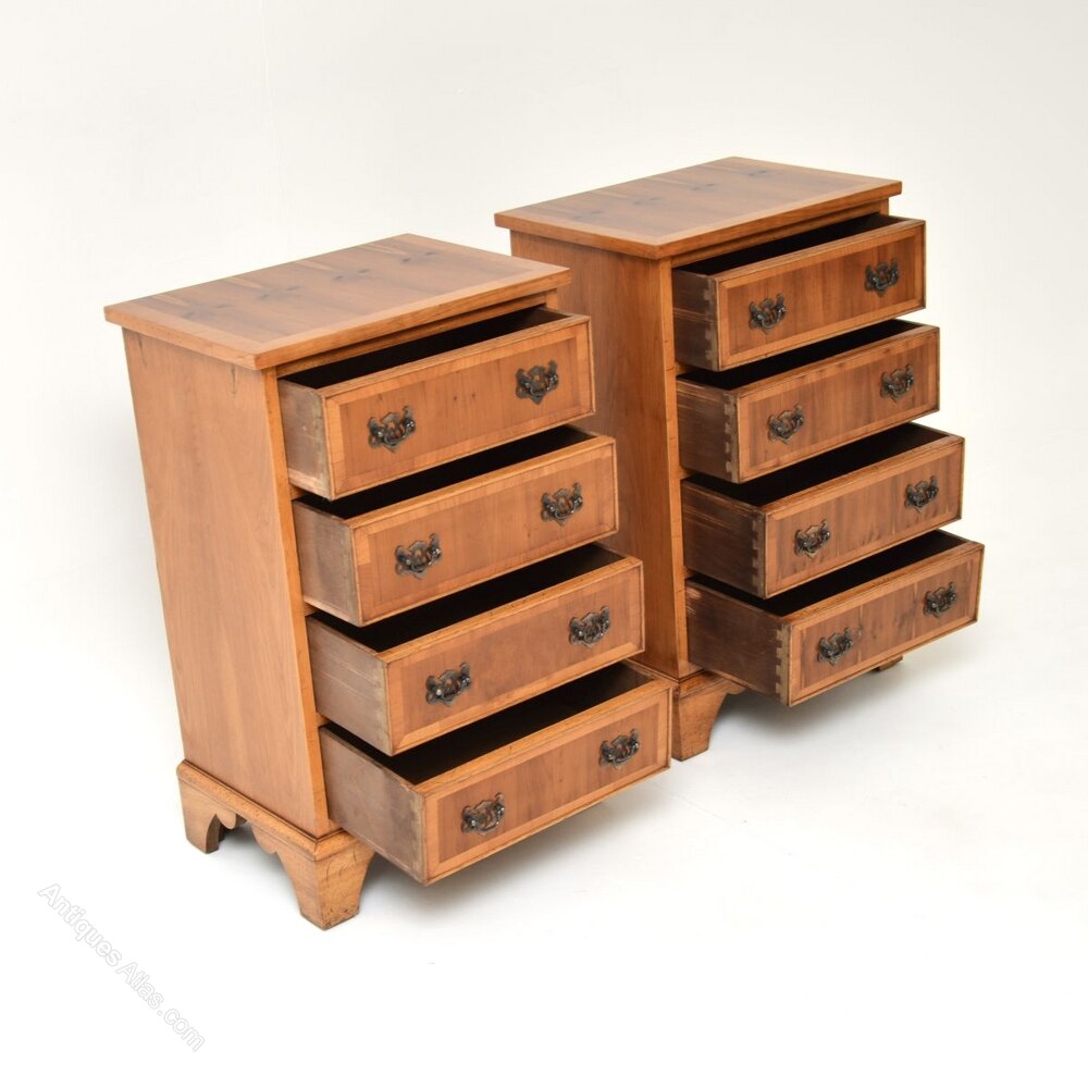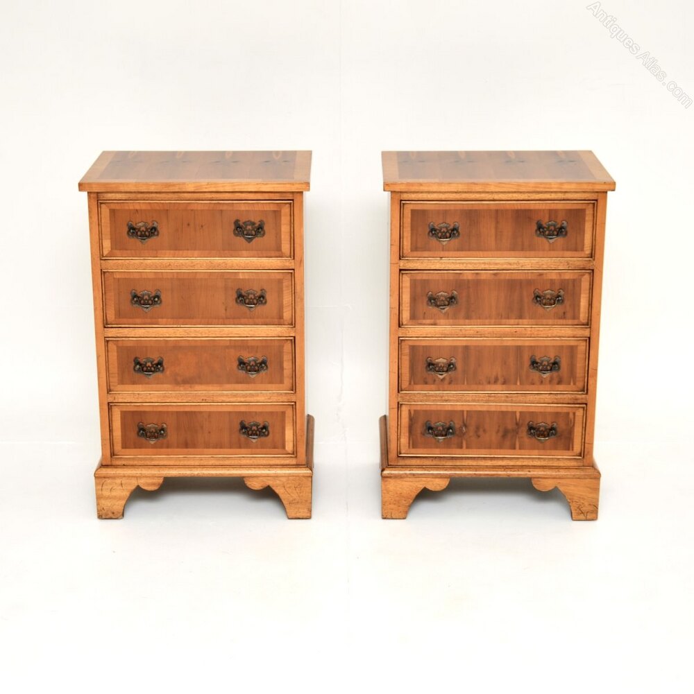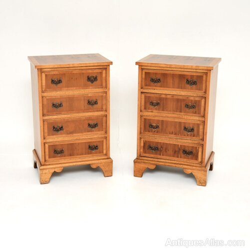 A lovely pair of antique Georgian style yew wood bedside chests. They were made in England, they date from around the 1950’s.They are of superb quality and are a very useful size. Each has four drawers with lovely brass handles, they sit on beautifully shaped bracket feet, the tops and drawer fronts have cross banded edges.