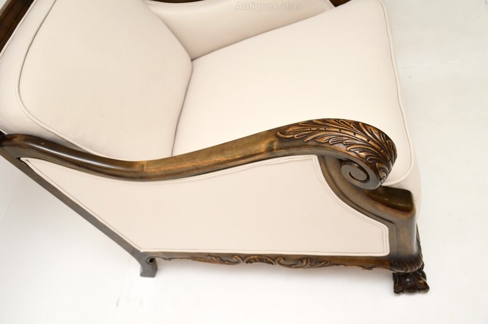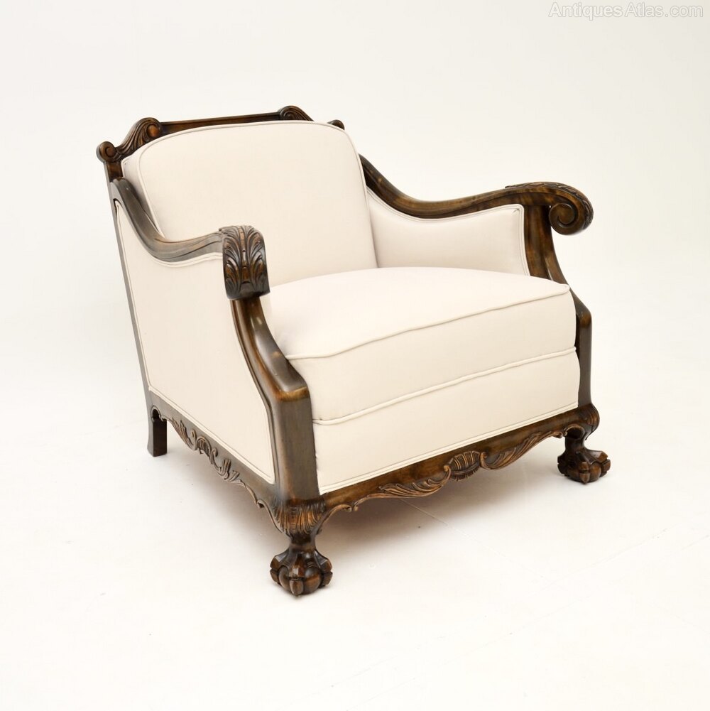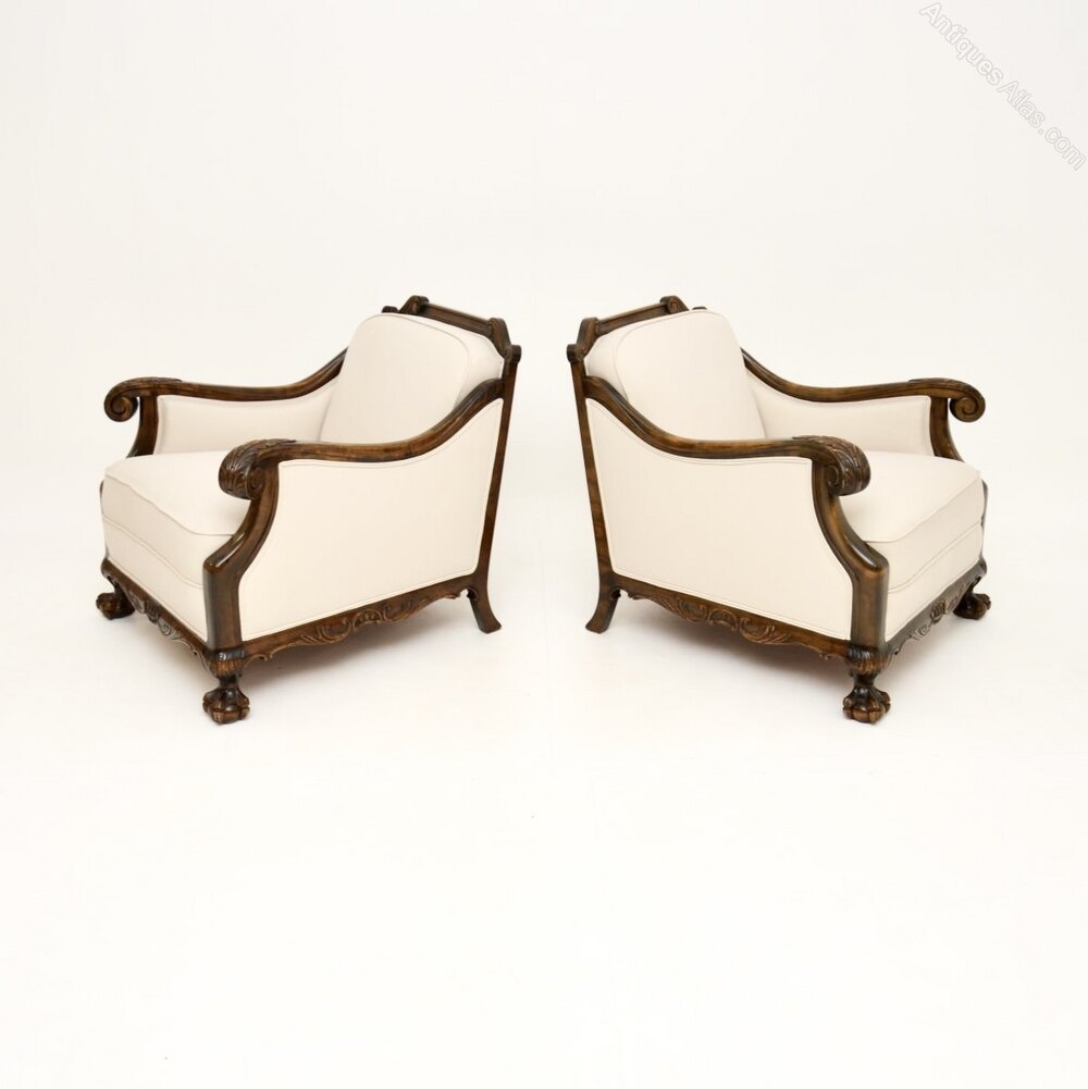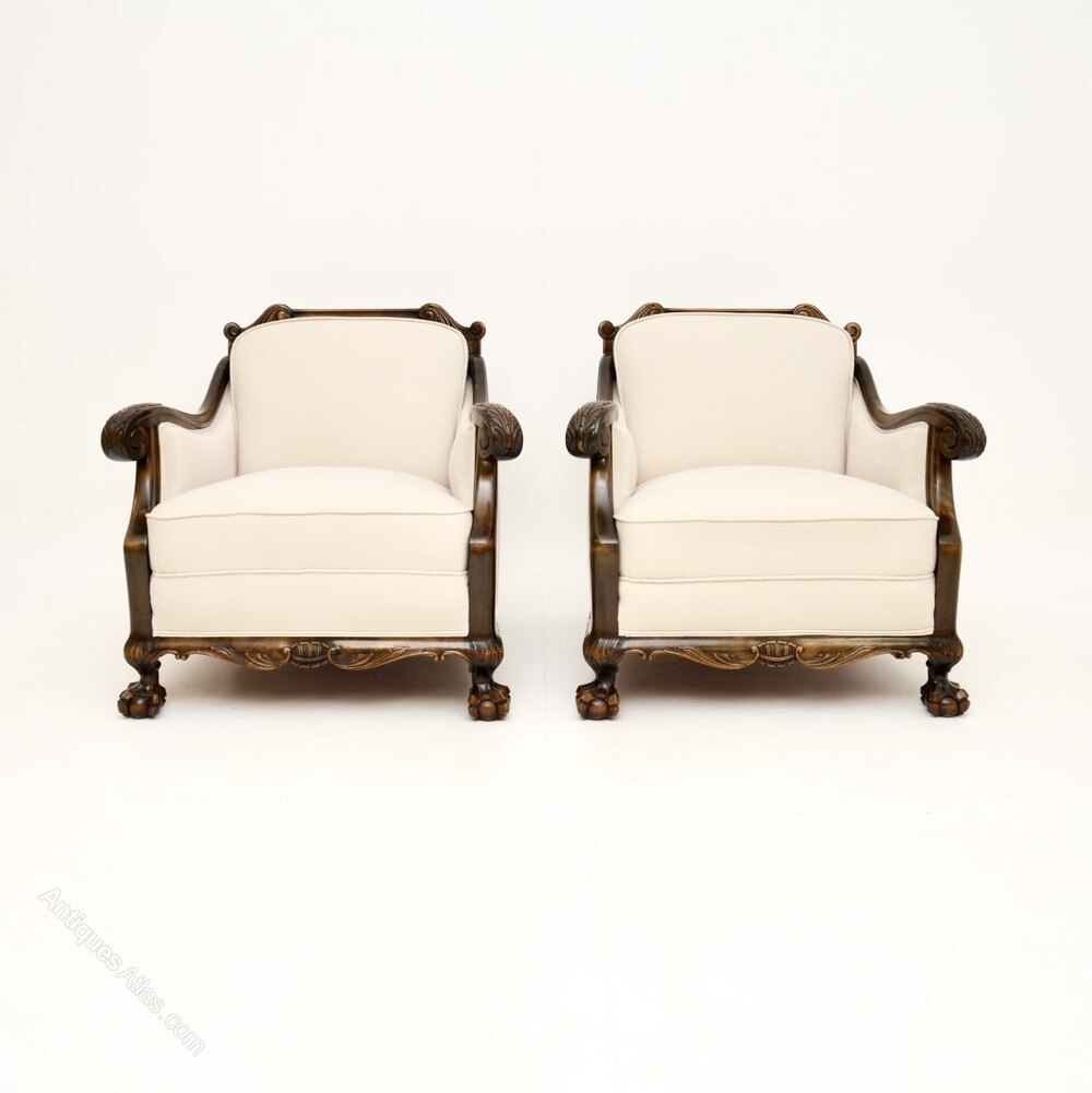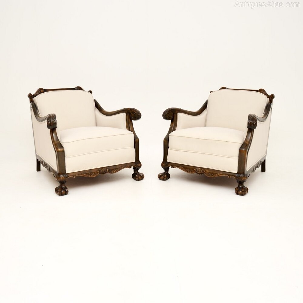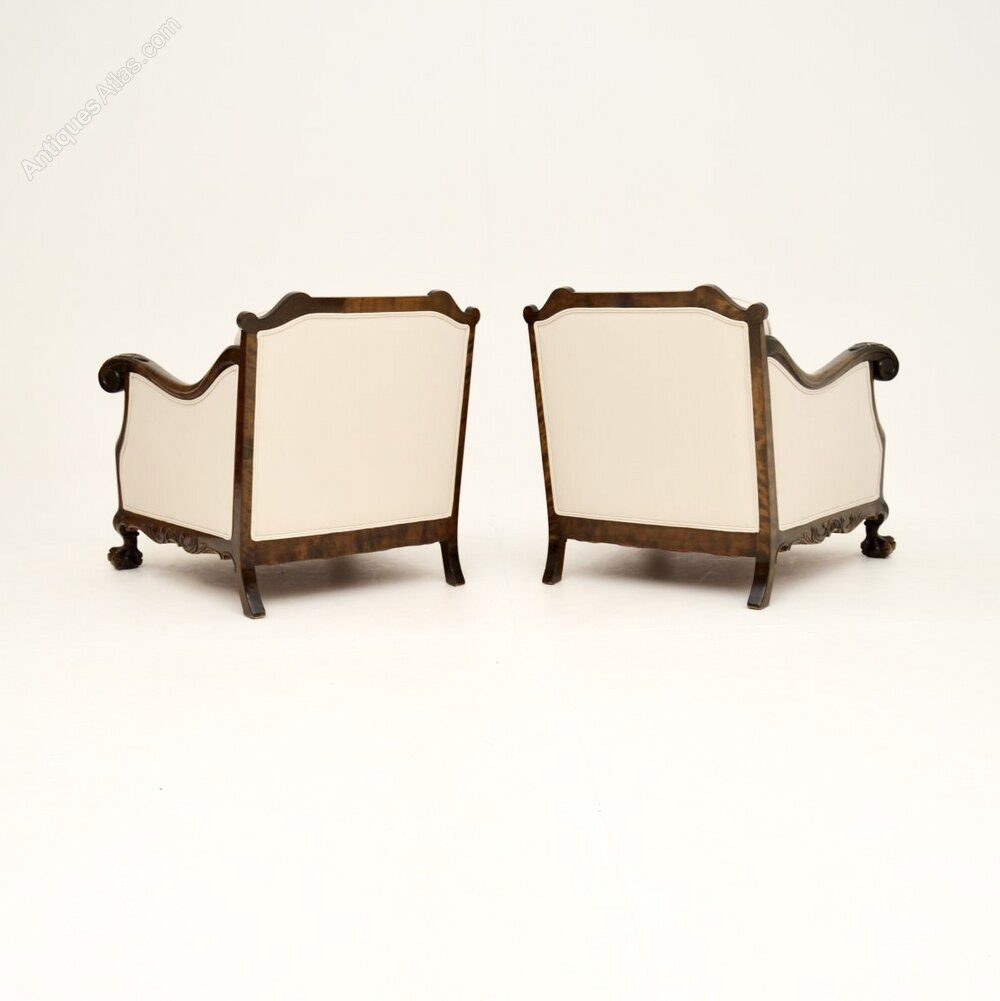 A beautiful pair of antique Swedish armchairs in satin birch. They were recently imported from Sweden, and date from around the 1900-1920 period.The quality is outstanding and they are well sprung, and very comfortable to relax in. They have a gorgeous design in the Chippendale style, with scrolled acanthus leaf armrests and claw and ball feet. The satin wood has a stunning colour, with wonderful light and dark silky grain patterns.