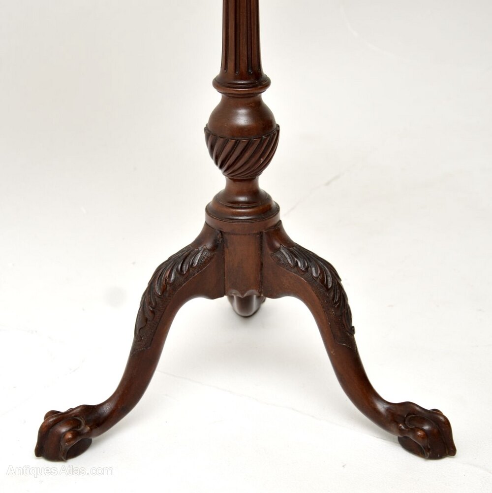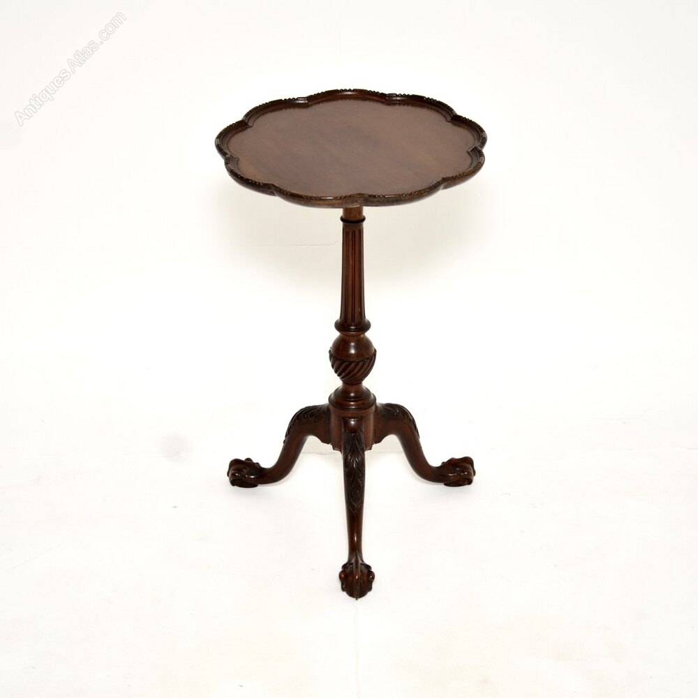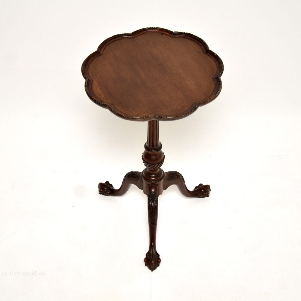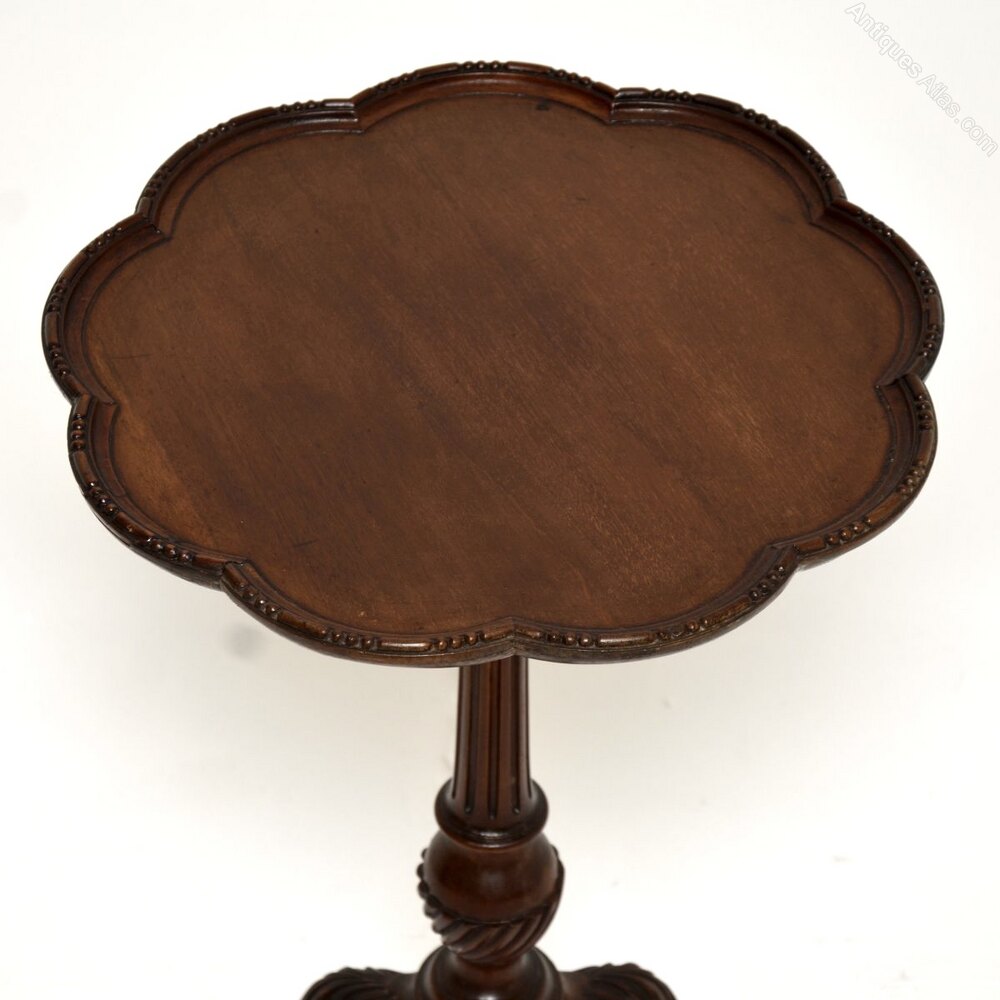 A beautiful and well proportioned antique mahogany occasional side table, made in England and dating from around the 1900-1910 period.It is of superb quality and is a very useful item. The flower shaped top has a slightly lipped and beaded edges, it sits on an elegant yet sturdy base with a fluted central column. The tripod legs have crisp acanthus leaf carving at the knees, terminating in claw and ball feet.