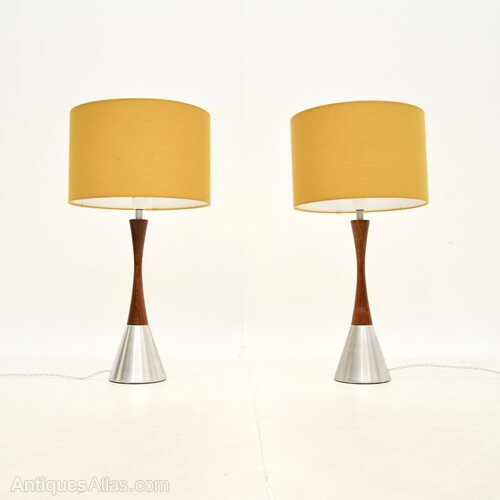We have had the rosewood stripped and re-polished to a very high standard, they have been re-wired and we have paired them with modern yellow shades. The condition is superb throughout.