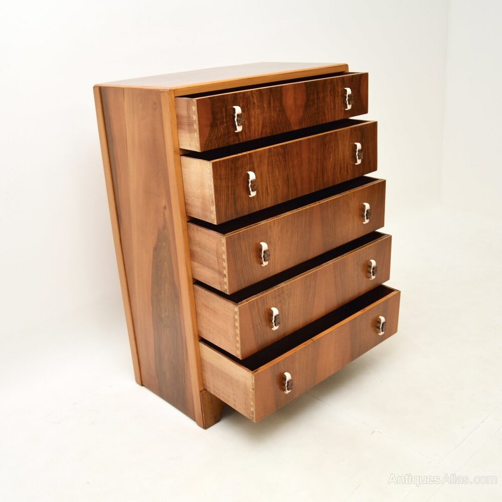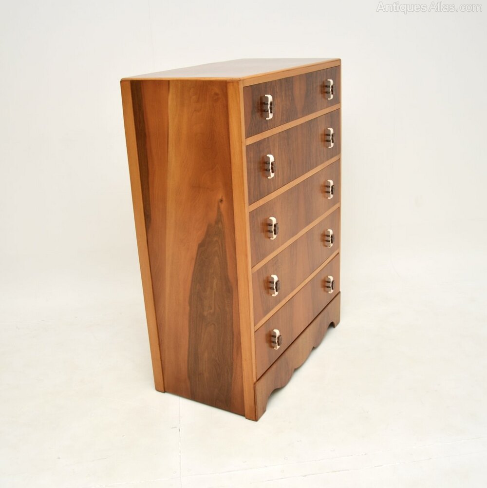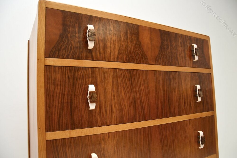 A wonderful Art Deco figured walnut chest of drawers, this was made in England and dates from the 1930’s.It is a great size and is of lovely quality. There is lots of storage inside the generous drawers, this sits on a shapely base, and it has beautifully crafted Bakelite handles. There are very beautiful figured walnut grain patterns and colour tones.