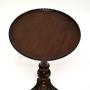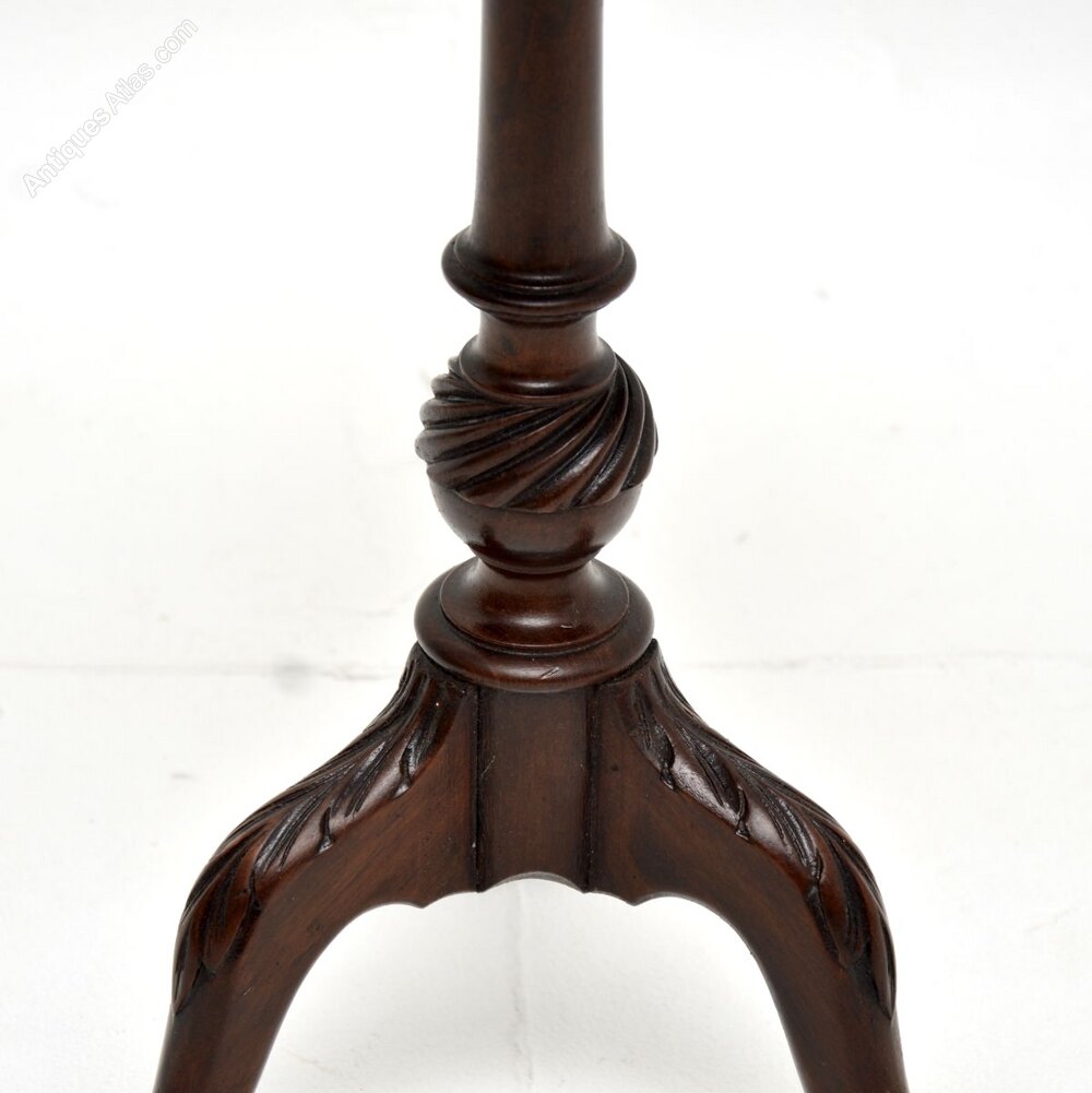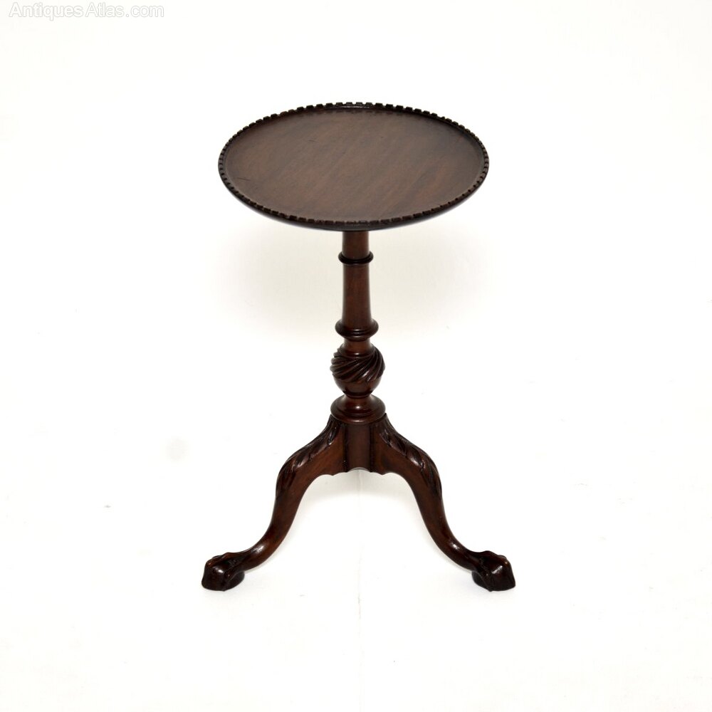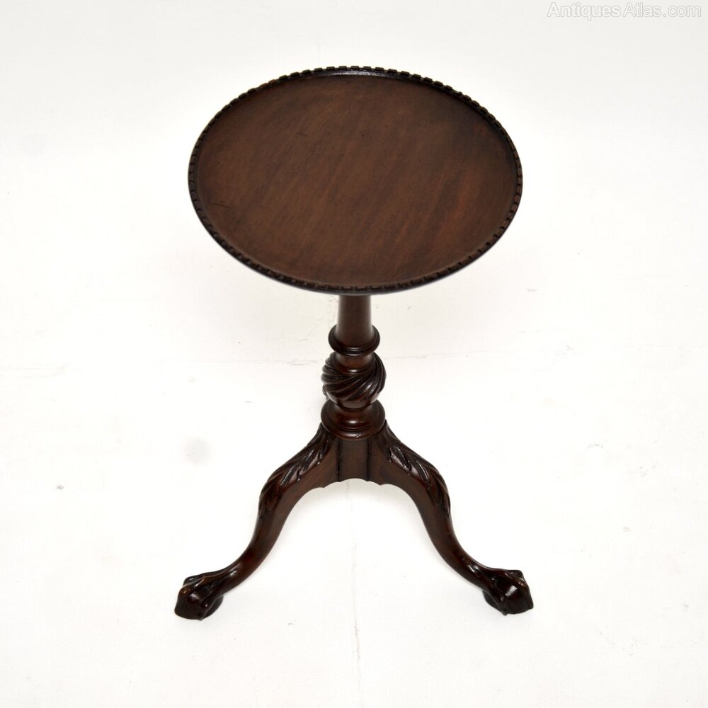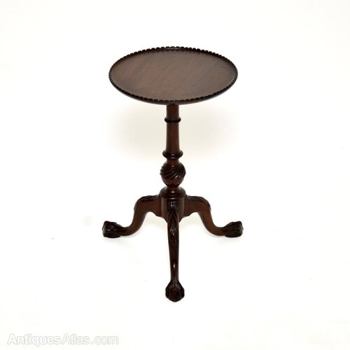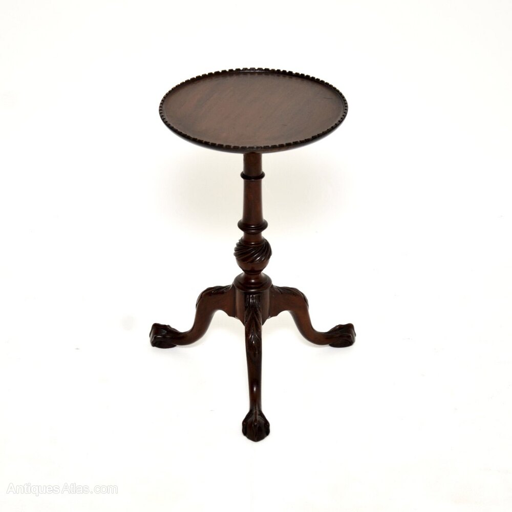 A beautiful and extremely well made antique mahogany wine table, made in England and dating from around the 1900-1910 period.It is of superb quality and is a very useful item. The circular top has a slightly lipped and beaded edges, it sits on a finely turned and carved base. The tripod legs have crisp acanthus leaf carving at the knees, terminating in claw and ball feet.
