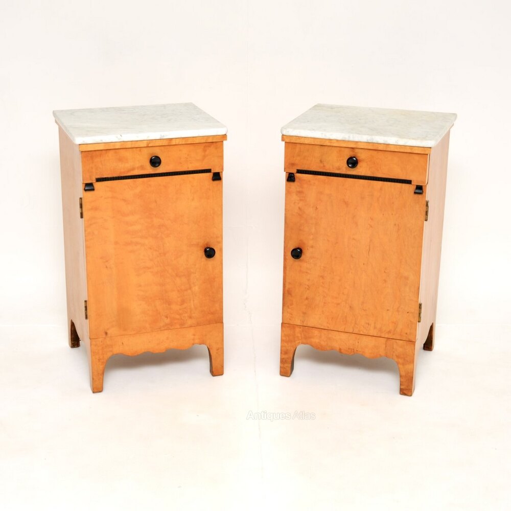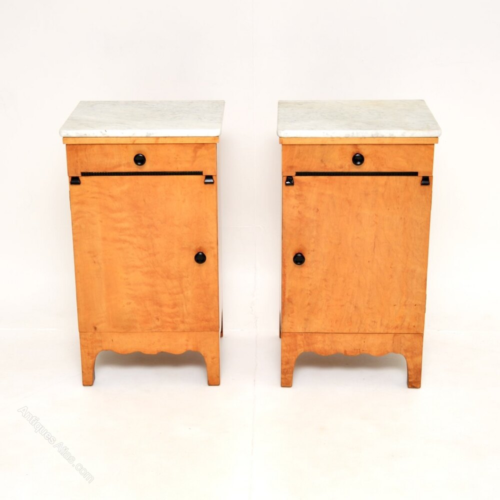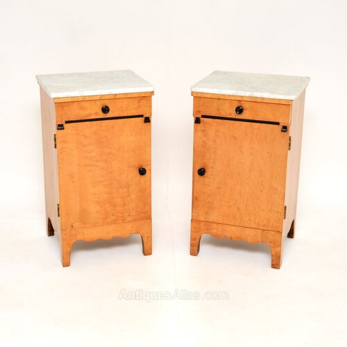 A beautiful pair of antique Swedish satin birch marble top bedside cabinets. They were recently imported from Sweden, they date from around the 1890-1910 period.The quality is superb, they are beautifully designed and are a useful size. The satin birch has gorgeous grain patterns and colour tones, contrasting nicely with the original cream marble tops.