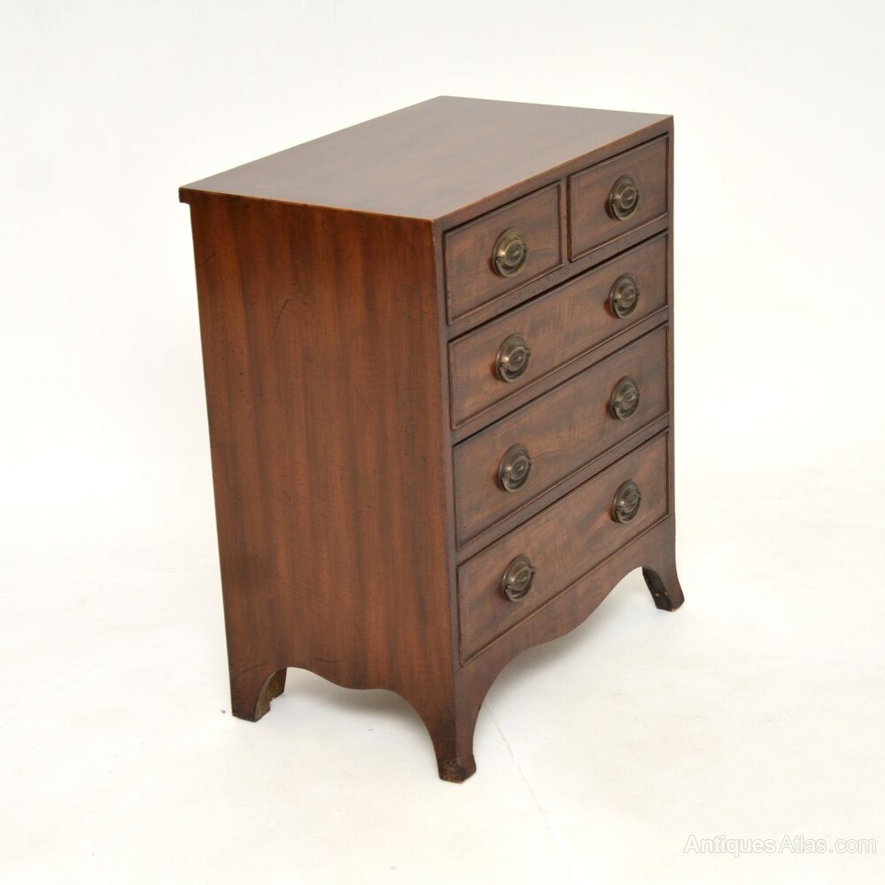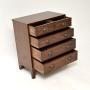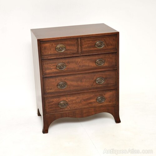It is of very fine quality, it is a very useful smallish size and has a beautiful design. It sits on splayed bracket feet, has lovely brass handles and gorgeous inlaid satin wood around the cross banded top and drawer fronts. The drawers all run smoothly, this has lots of storage space. The mahogany has an absolutely gorgeous colour tone and patina.