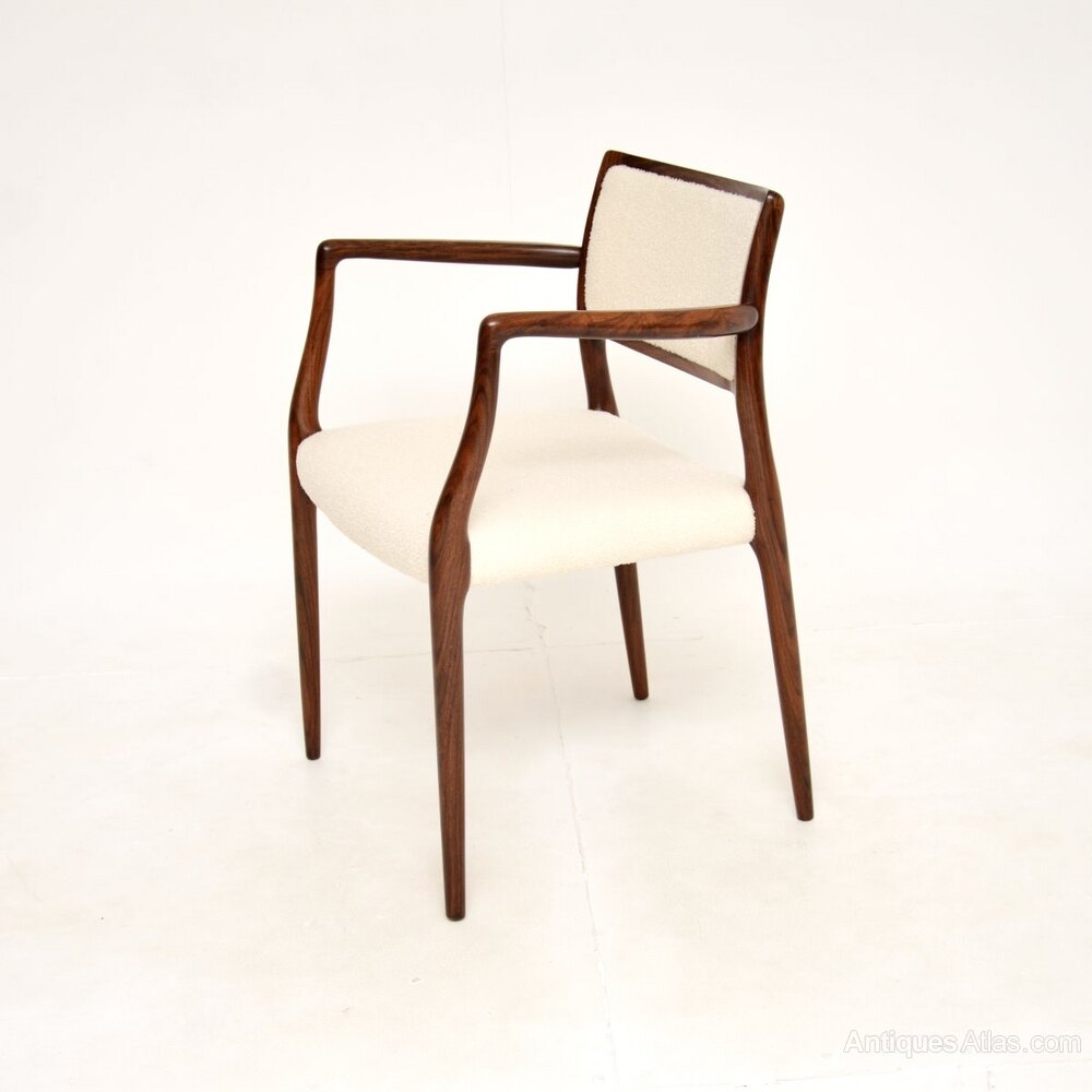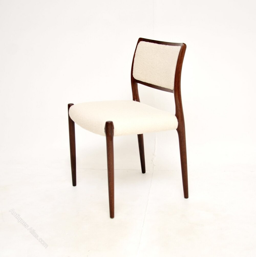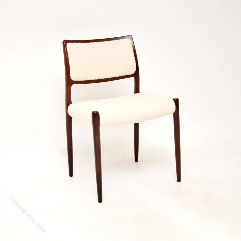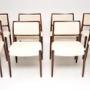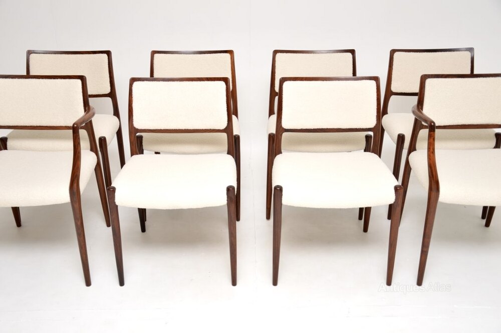 An exceptional set of eight Danish rosewood dining chairs by Niels Moller. They were made in Denmark by JL Moller Mobelfabrik, they date from the 1960’s.The quality is outstanding as with all Niels Moller chairs, they are beautiful to look at, they are comfortable and supportive. This set consists of six model 80 chairs and two model 65 carver armchairs.