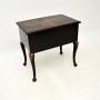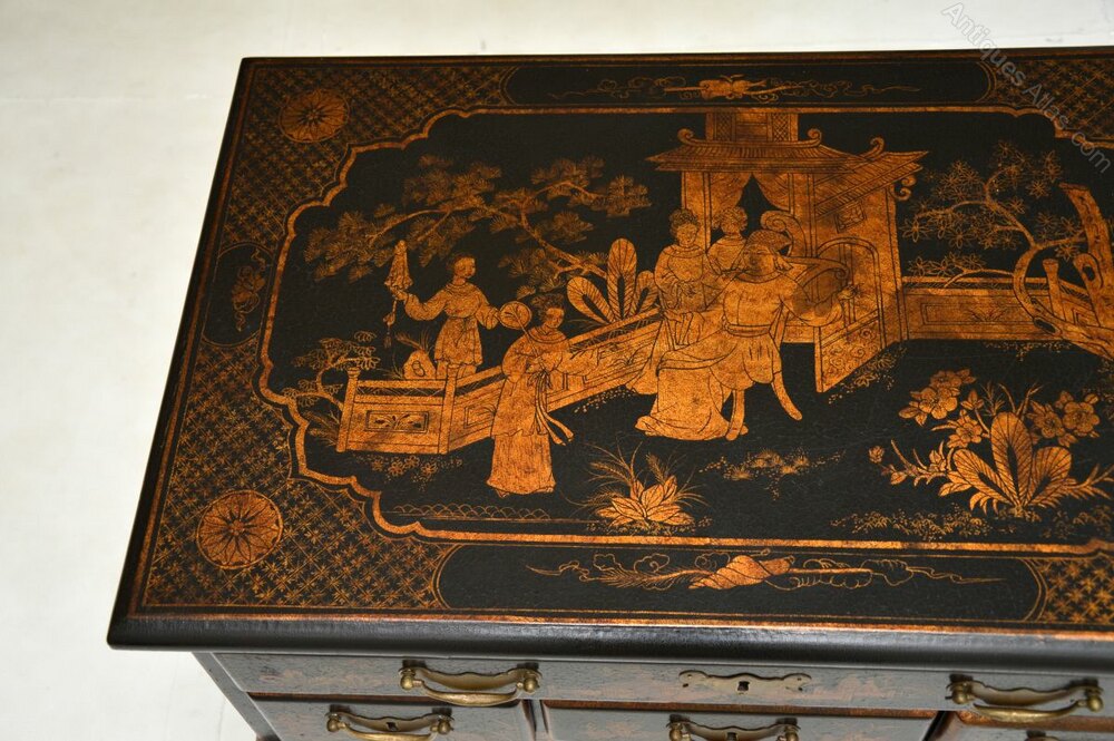 A charming and very well made antique lacquered Chinoiserie lowboy side table in the Georgian style. This was made in England, it dates from around the 1950’s.It is of very good quality, this is a lovely compact size and it is beautifully designed. It is full of character, there in plenty of storage space in the drawers, the lacquered Chinoiserie decorations are gorgeous. This stands on cabriole legs, the drawers have fine quality brass handles.