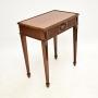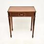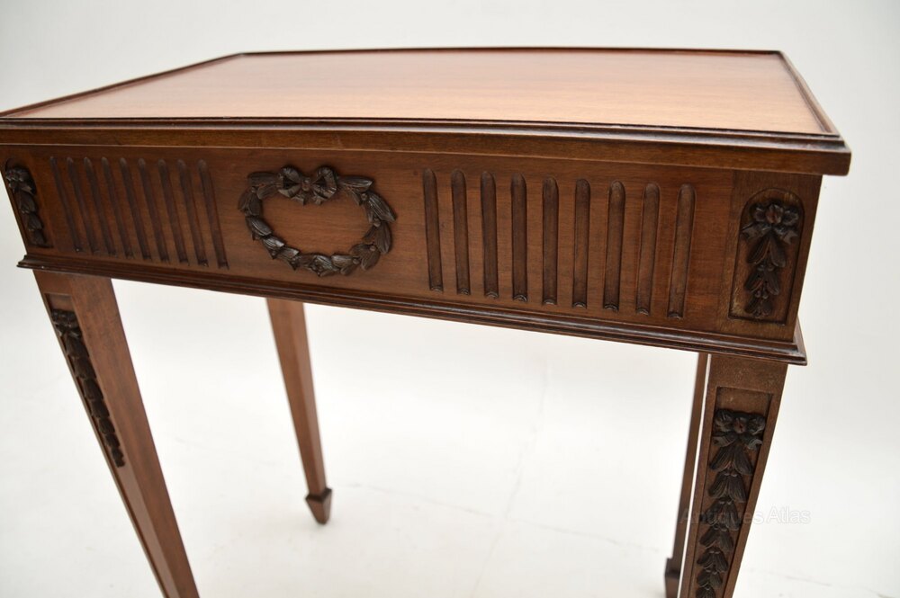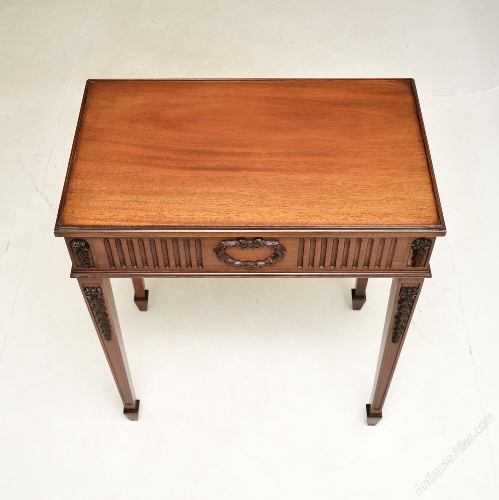 A beautiful antique mahogany side table in the Sheraton style. This was made in England, it dates from around the 1900-1910 period.The qality is excellent, this is finely made with beautiful carving on the edges. It is a very useful size, sitting on finely tapered legs that terminate in spade feet. This is nicely finished on all sides, so can be used as a free standing item.