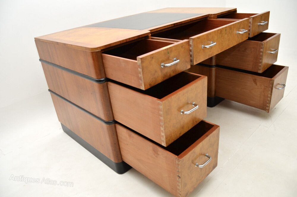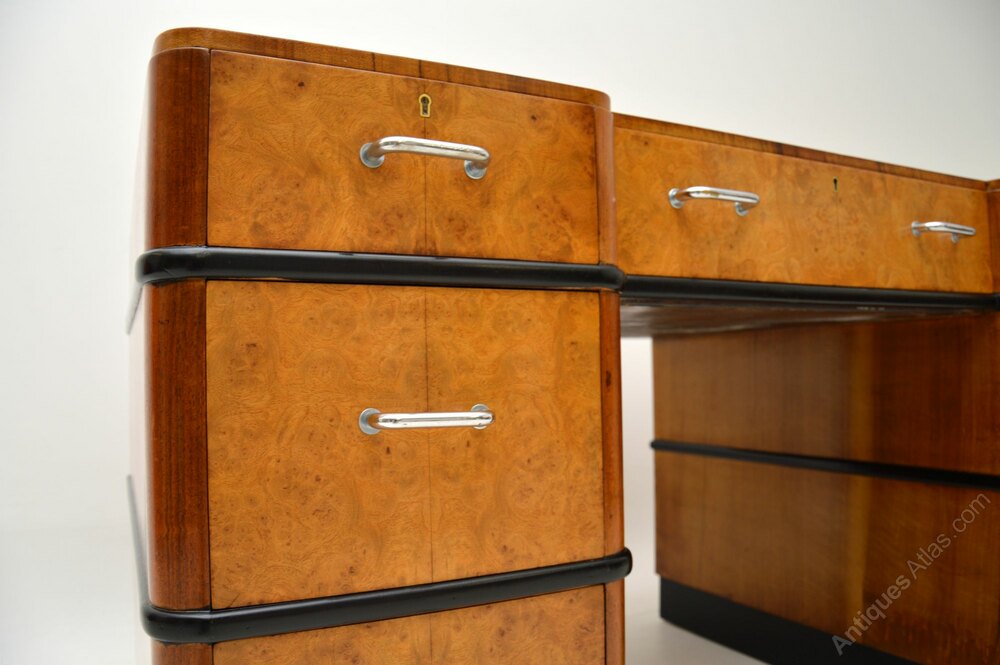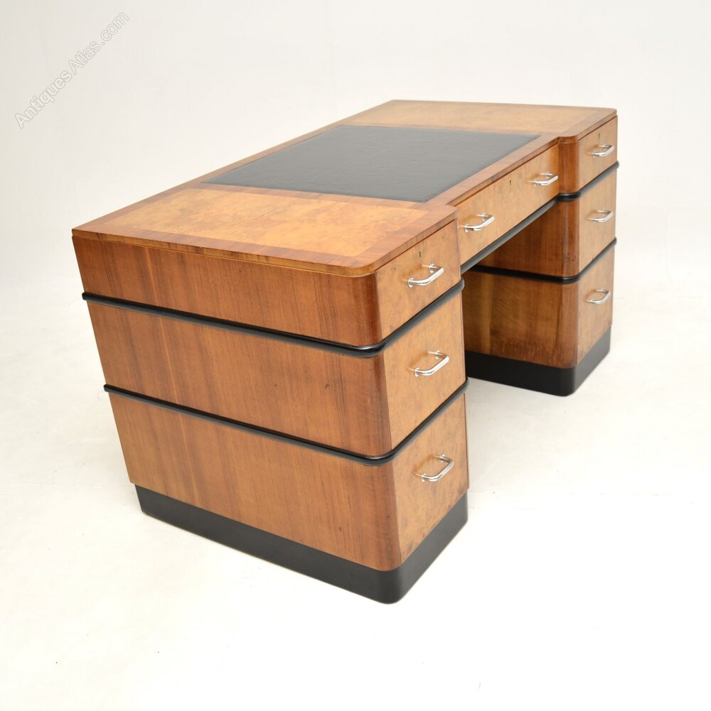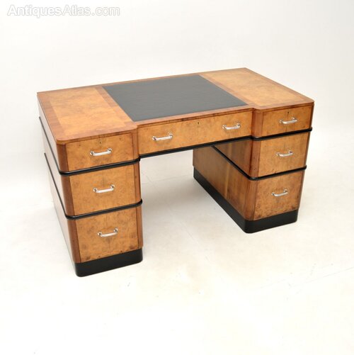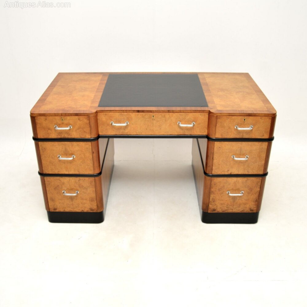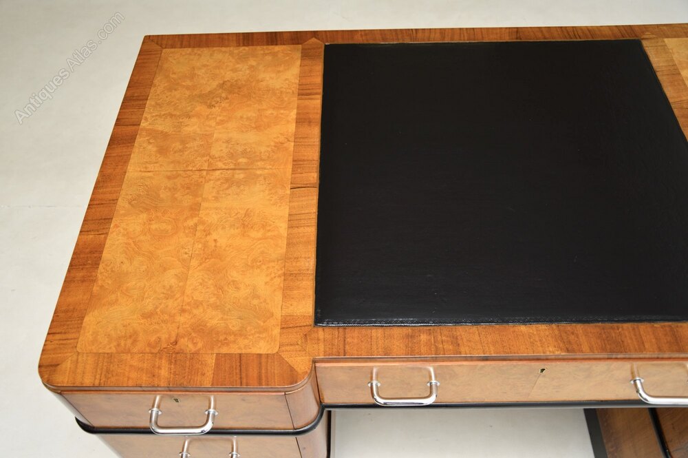 A magnificent Art Deco burr walnut pedestal desk. This was made in England, it dates from around the 1920-30’s.The quality is outstanding, this is a large and impressive size. There are beautiful burr walnut grain patterns on the top and drawer fronts, the top edges are also cross banded. There is an inset leather writing surface in the centre of the top, this is beautifully finished on all sides, so can be used as a free standing item. The stainless steel handles are also beautifully crafted, they contrast nicely with the walnut.
