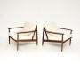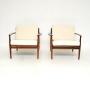 A rare and absolutely stunning pair of Danish vintage afromosia armchairs in the manner of Grete Jalk for France and Son. They were made in Denmark, and date from the 1960’s.They are of outstanding quality, the solid afromosia frames have an absolutely gorgeous design, and look amazing from all angles. The grain patterns and colour tones are beautiful, they have a stunning design to the backs and have lovely brass fixtures.