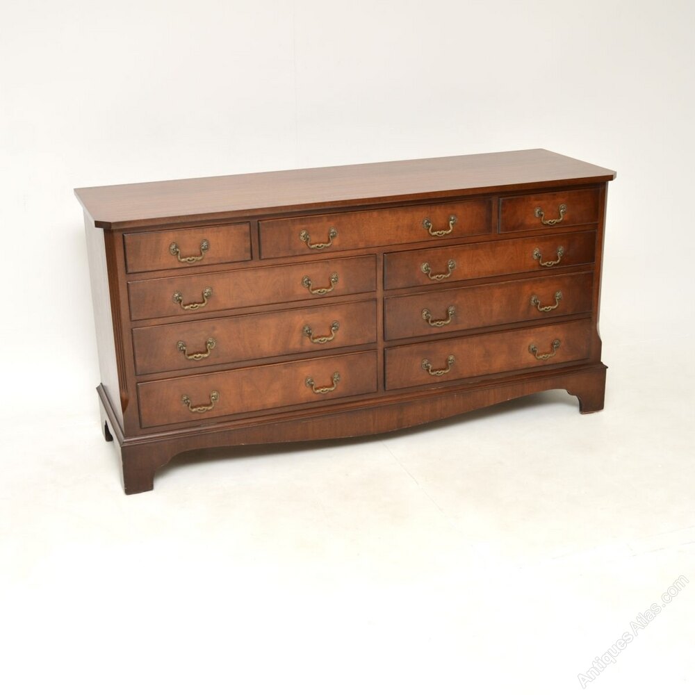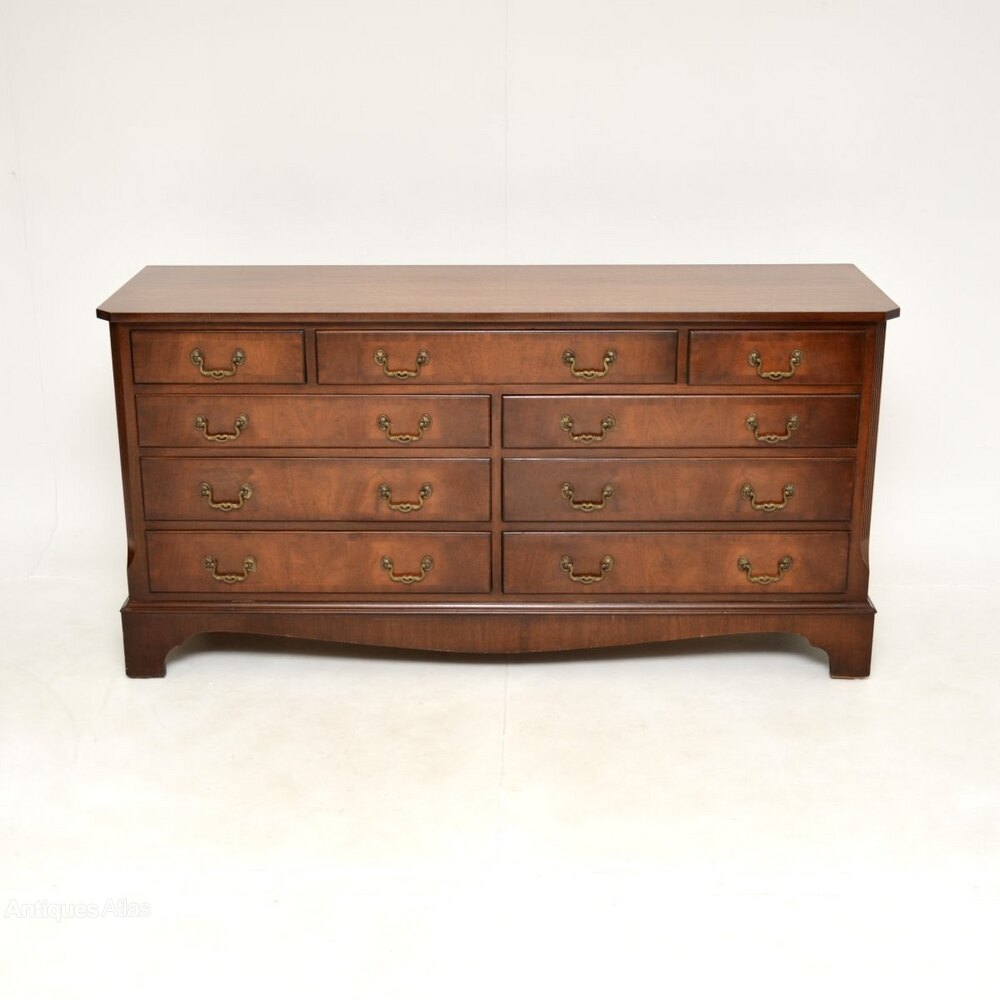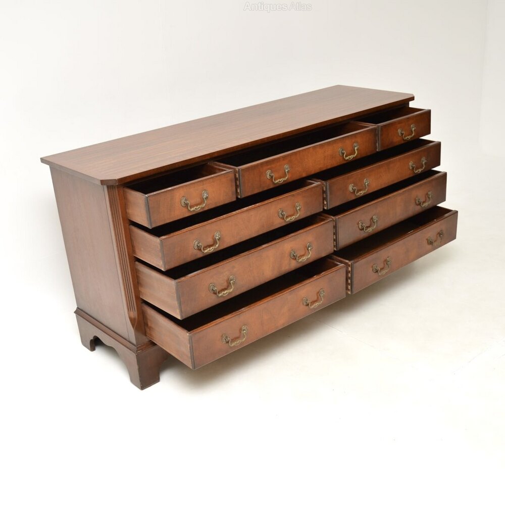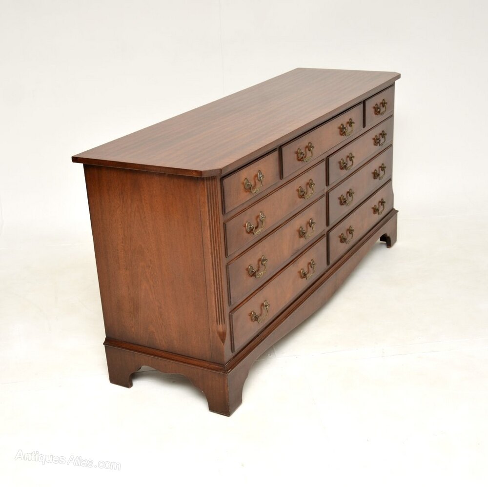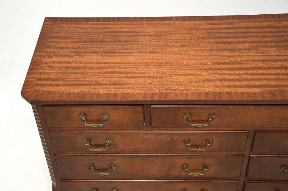 A smart and extremely well made antique Georgian style mahogany chest of drawers / sideboard, which would also be ideal for a TV stand. This was made in England and dates from around the 1930-50’s.It is of amazing quality and is a very useful size, with lots of storage space inside the generous drawers. The top and drawer fronts are cross banded, this has lovely brass handles. It sits on a base with bracket feet, it has lovely reeded and canted corners.