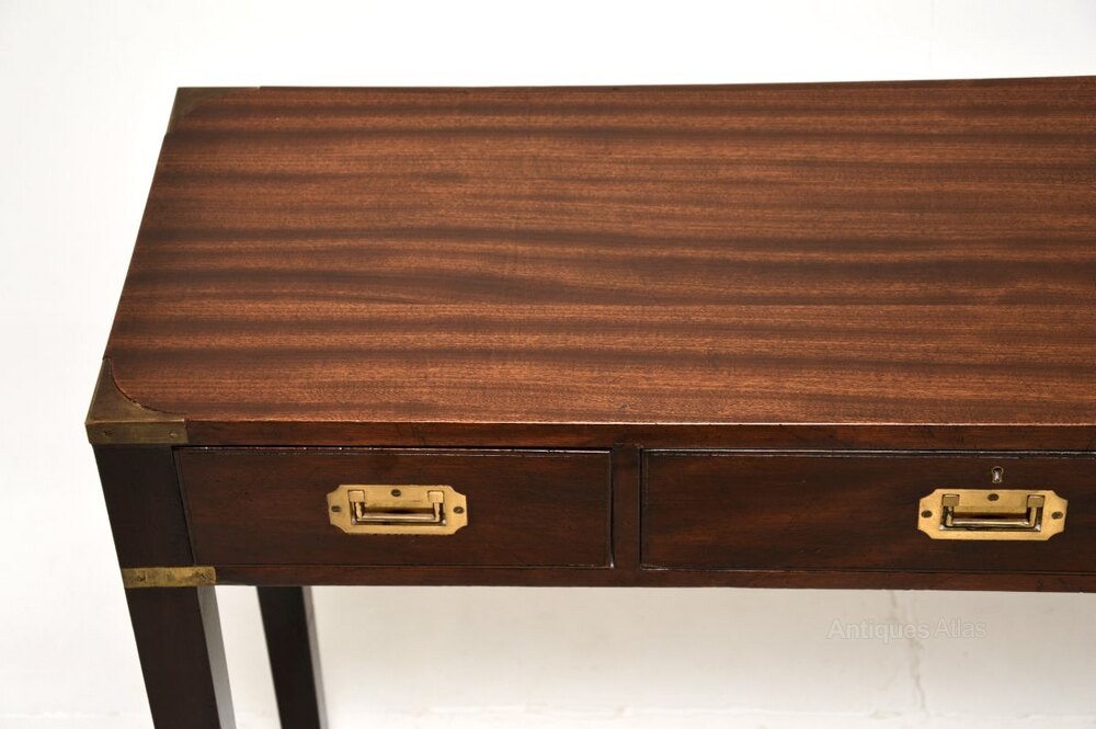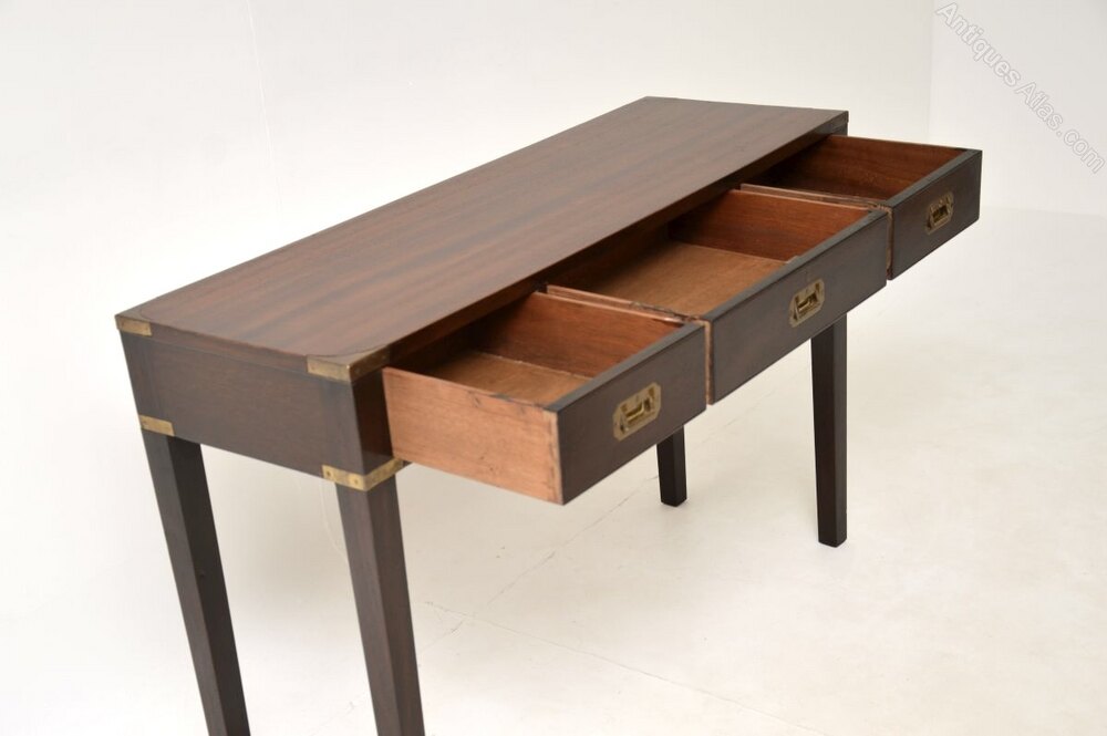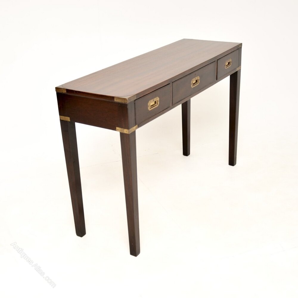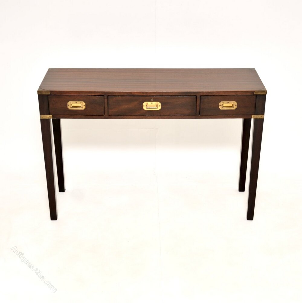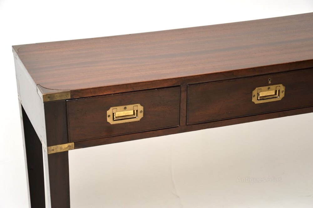 An excellent antique military campaign style mahogany and brass console table. This was made in England, it dates from around the 1930-50’s period.It is very well made and it is a great size. This has brass fixtures on the corners and lovely brass military style handles. It stands on tapered legs, and is nicely polished on all sides including the back, so can be used as a free standing item.