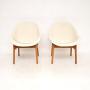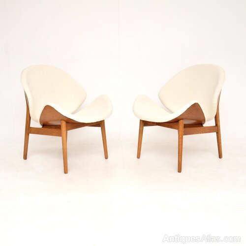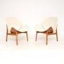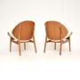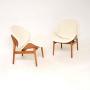 A stunning and iconic pair of Danish vintage lounge chairs by Hans Olsen. They were made by N.A Jorgensen in Denmark, and date from the 1960’s.This is the model 134 orange chair, so called as it resembles a peeled orange from the back. The quality is outstanding, they are petite yet surprisingly very comfortable. The shell backs and seats are made from teak, the frames are solid oak.