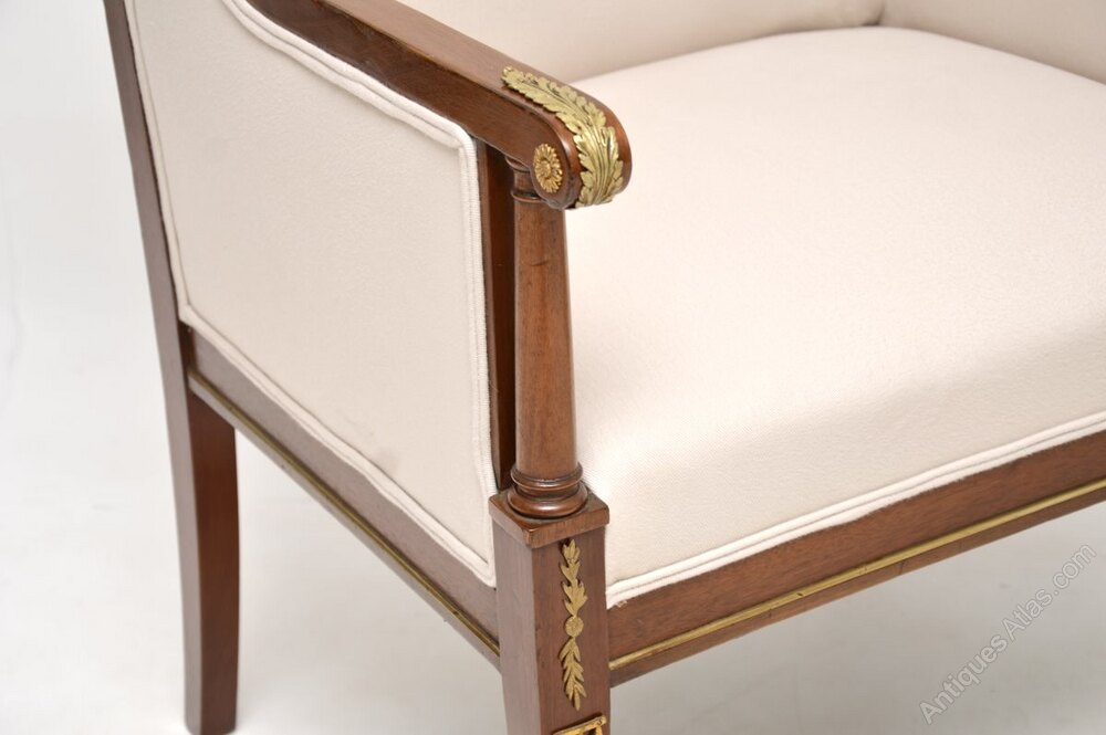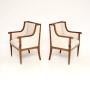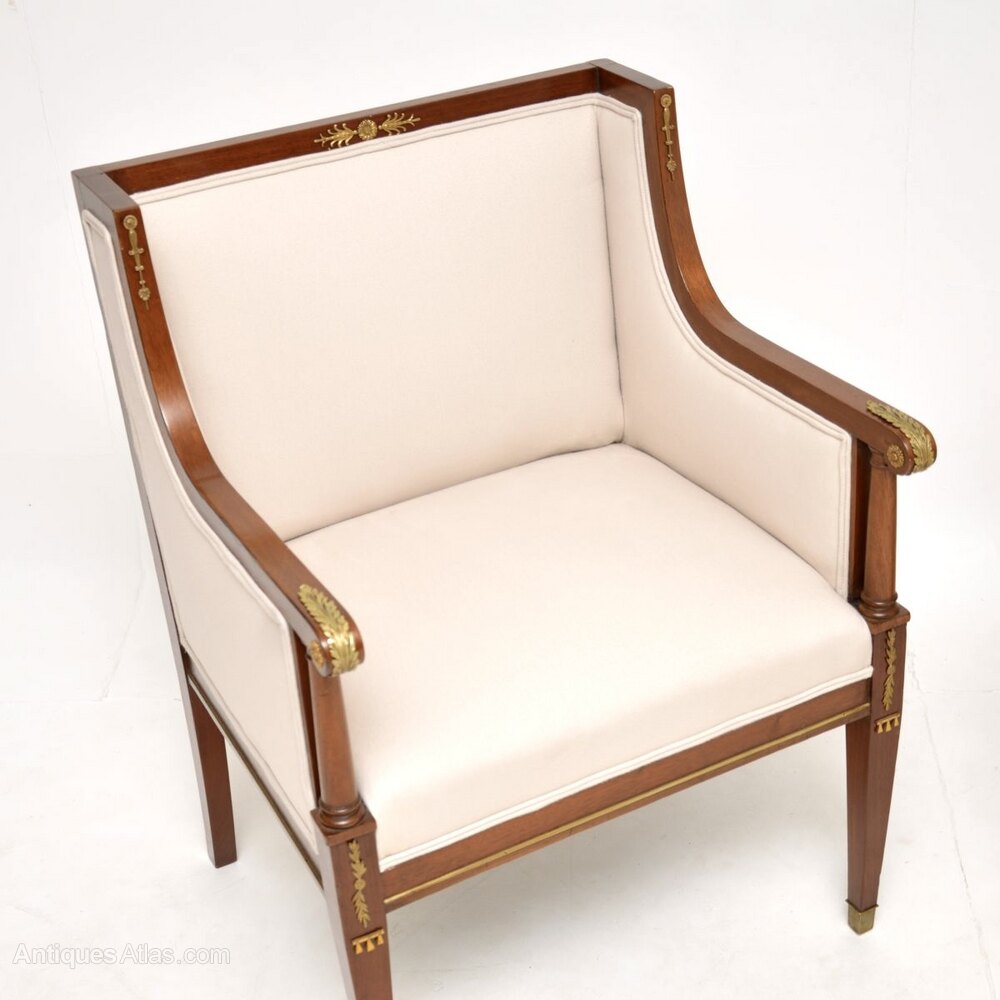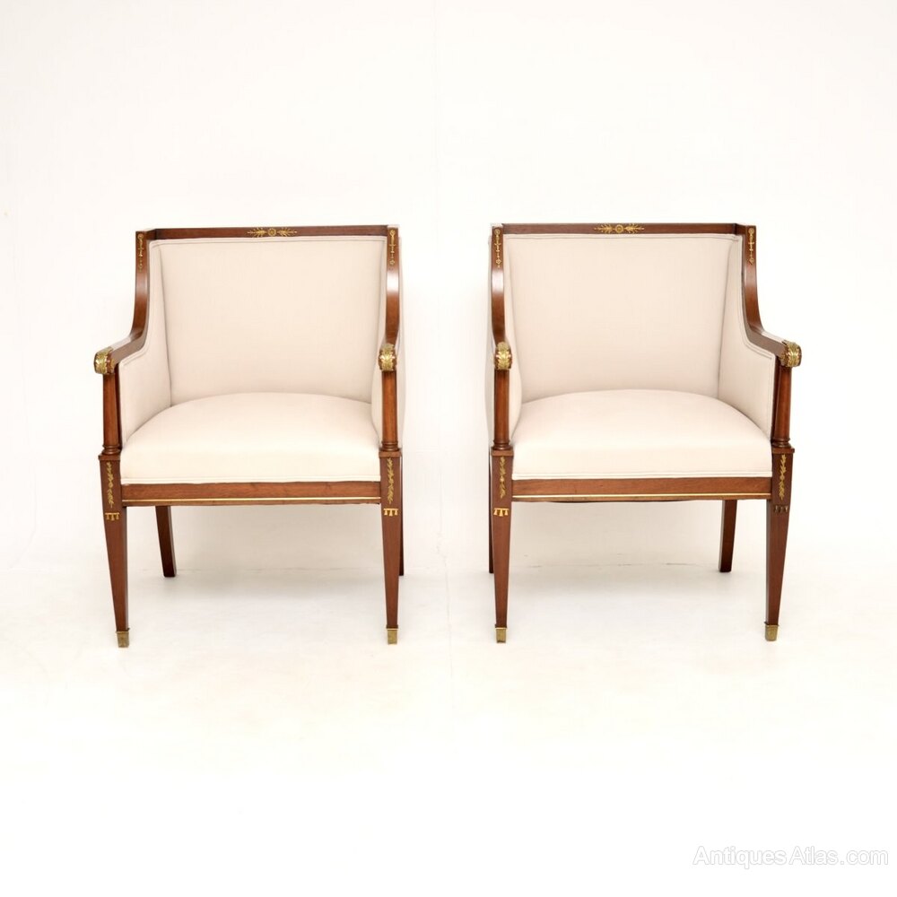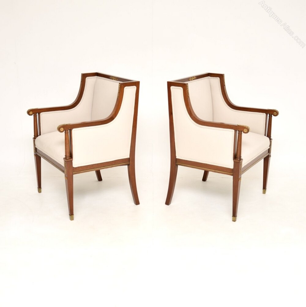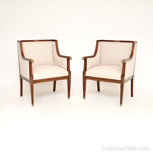 A stunning pair of antique Swedish neoclassical mahogany armchairs. They are in the Gustavian style, they were recently imported from Sweden and date from around the 1880-1900 period.The quality is outstanding, and they are of lovely proportions. The solid mahogany frames are beautifully designed, with very high quality ormolu mounts on the arms, lower edges of the seats and the upper edges of the back rests.