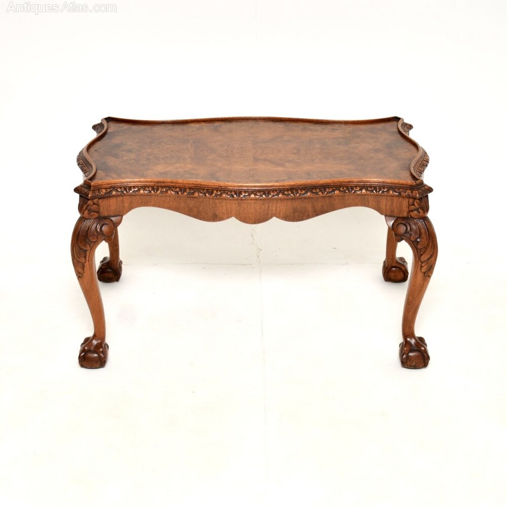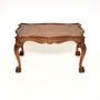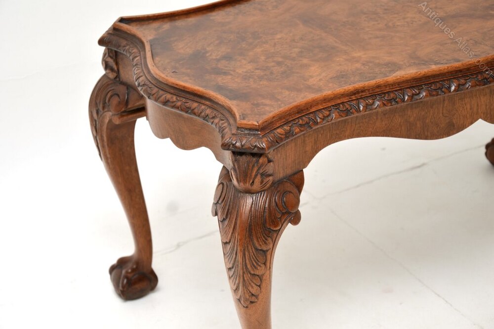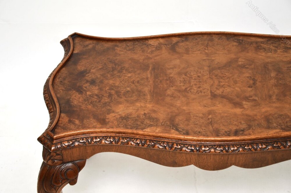 A stunning antique Queen Anne style burr walnut coffee table. This was made in England, it dates from the 1920’s.It is of superb quality, with beautifully shaped and carved serpentine edges. The top has gorgeous burr walnut grain patterns with slightly raised edges. This sits on cabriole legs with acanthus leaf carving at the knees, terminating in claw and ball feet.