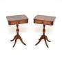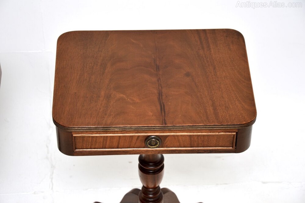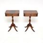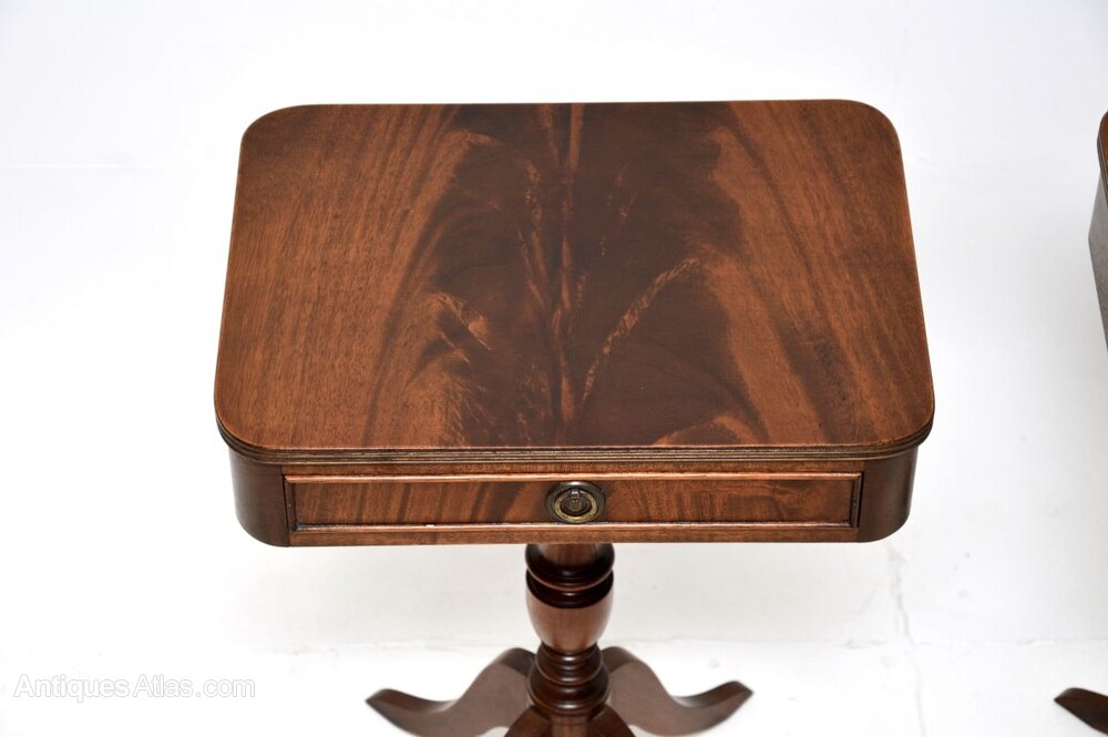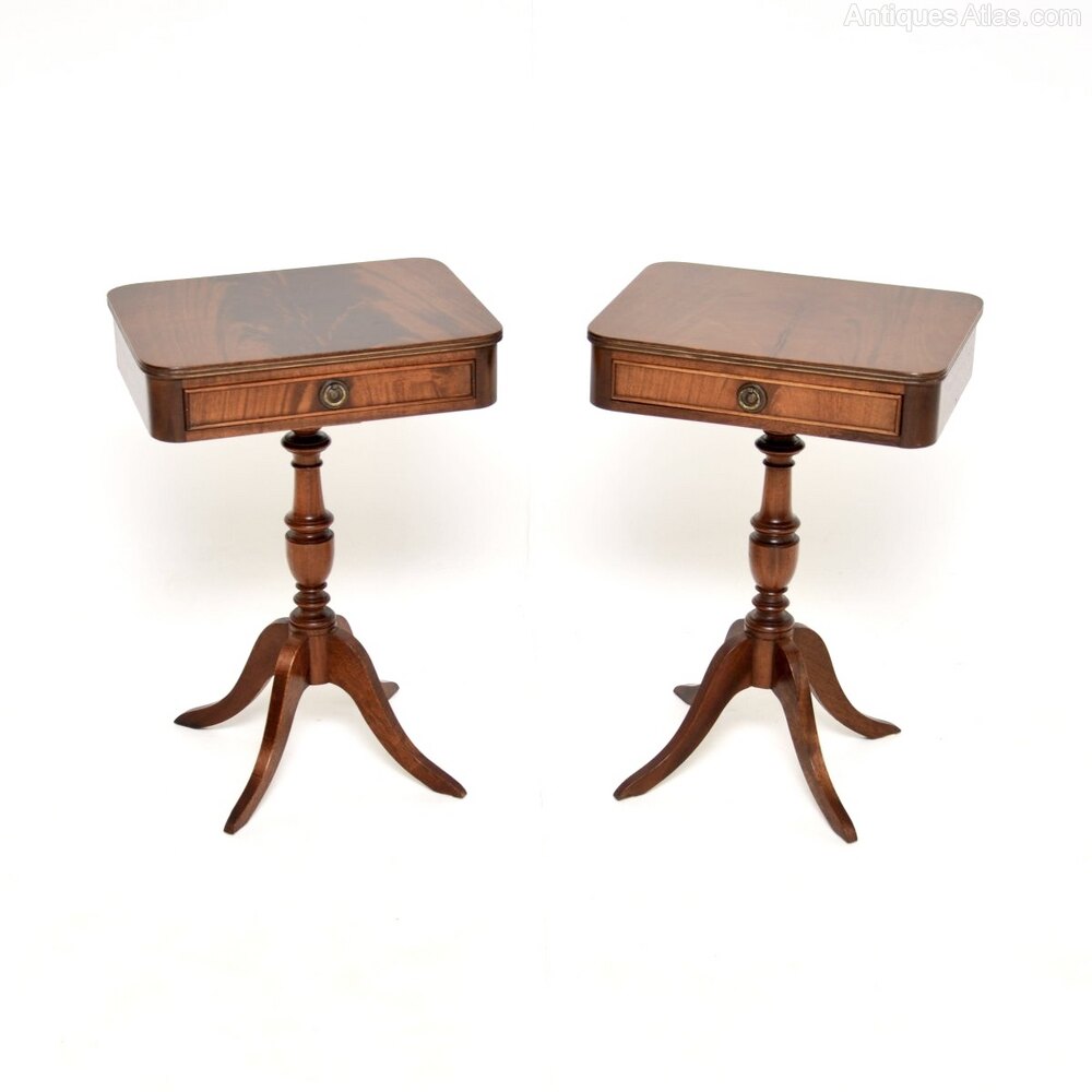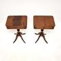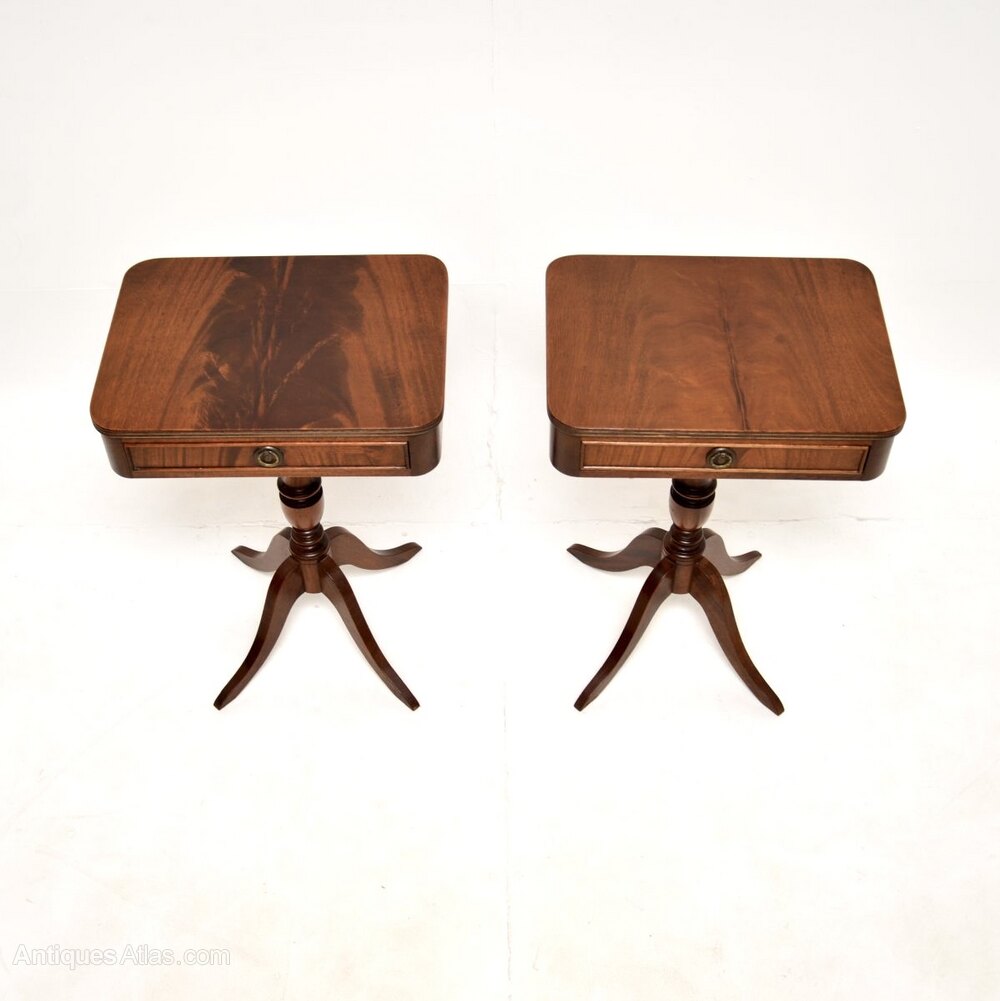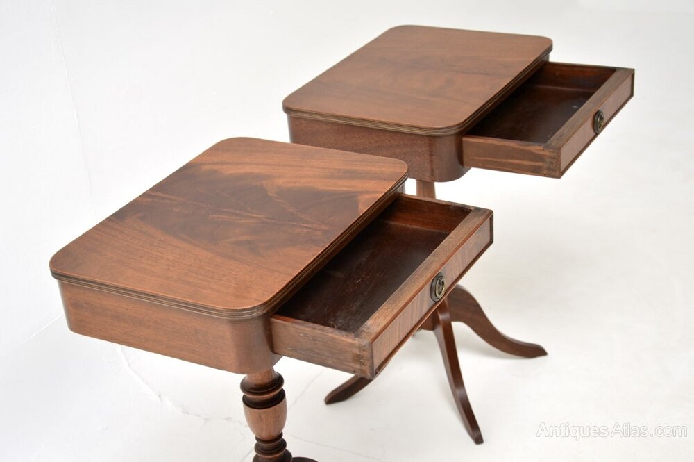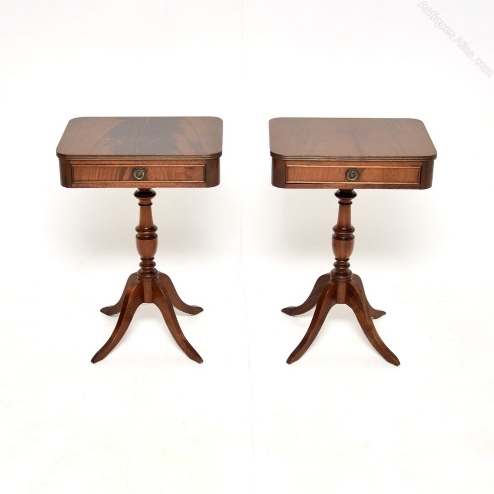 A beautiful and elegant pair of antique Regency style mahogany side tables. They were made in England, and date from around the 1950’s.The quality is very good and they are a very useful size. The rectangular tops have a single drawer with a brass ring pull handles, they are nicely finished on the backs as well, so can be used as free standing tables. They stand on elegant yet sturdy splayed legs.