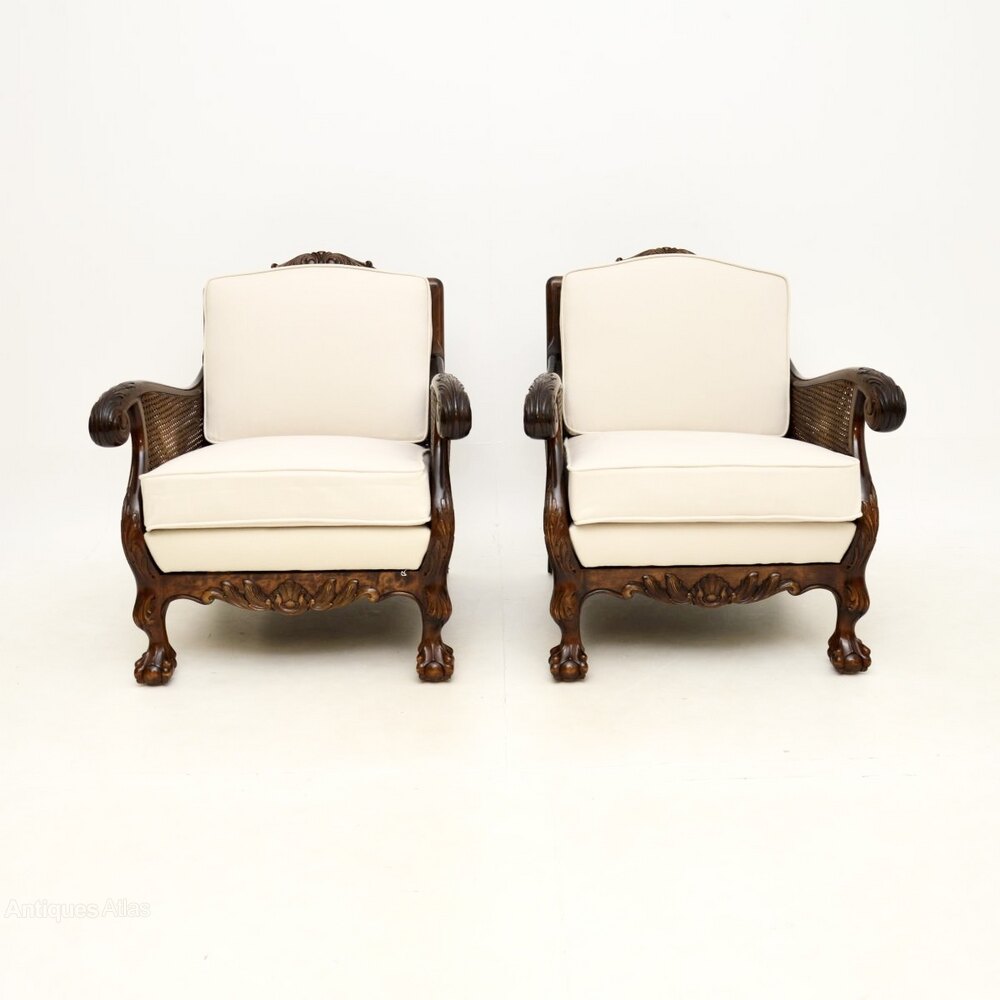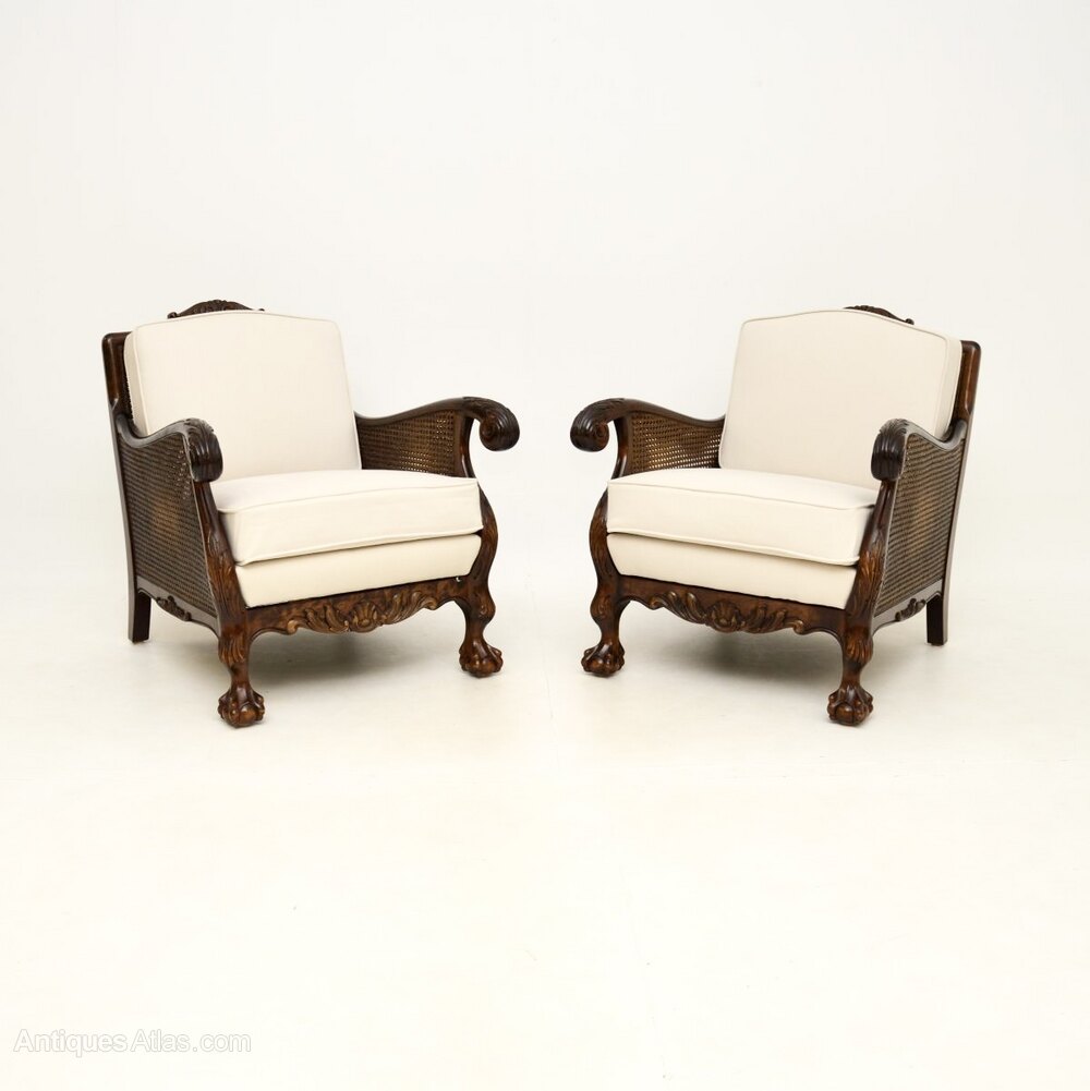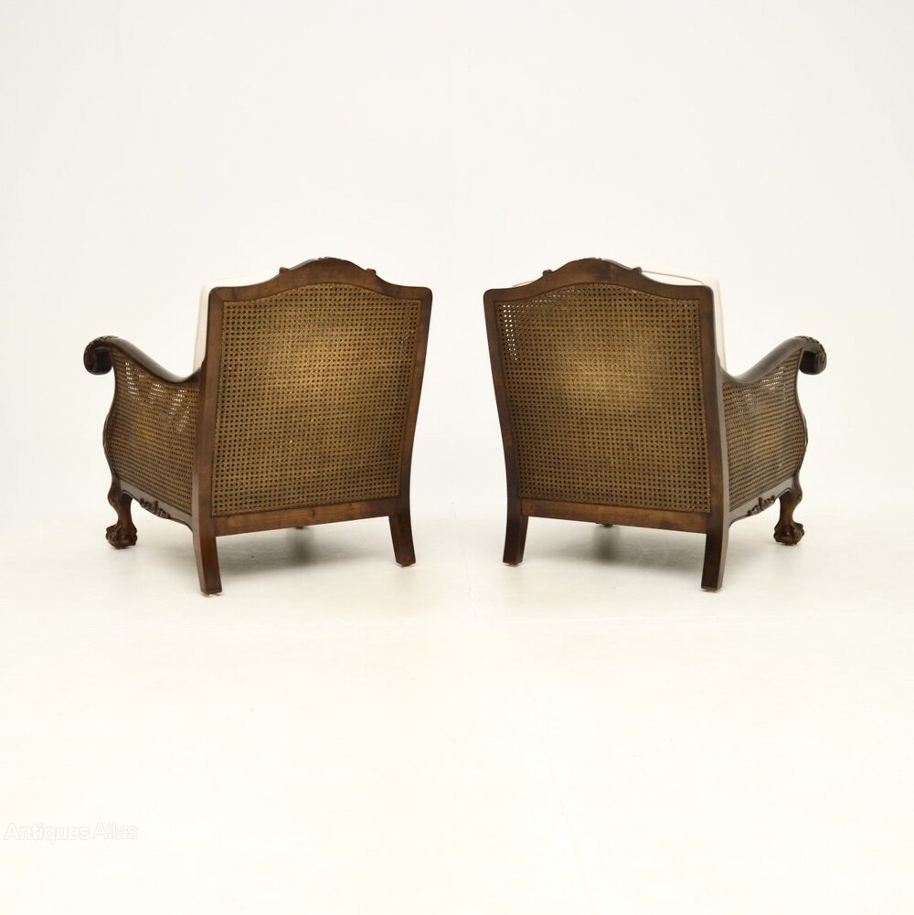 A beautiful pair of antique Swedish satin birch bergère armchairs in the Chippendale style. They were recently imported from Sweden, and they date from around the 1920-30’s period.They have beautifully shaped frames and detailed carvings all over. They are double caned on the backs and sides with wonderful carved acanthus leaf scroll over arms, carved shaped legs with claw and ball feet. The satin birch wood has that typical silky look with gorgeous light and darker shades.