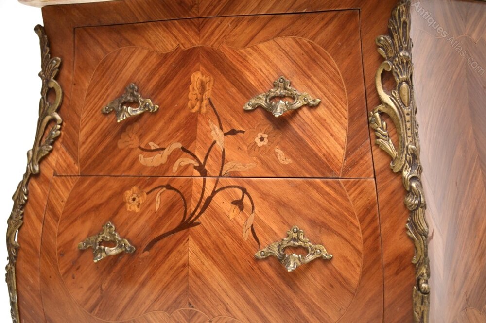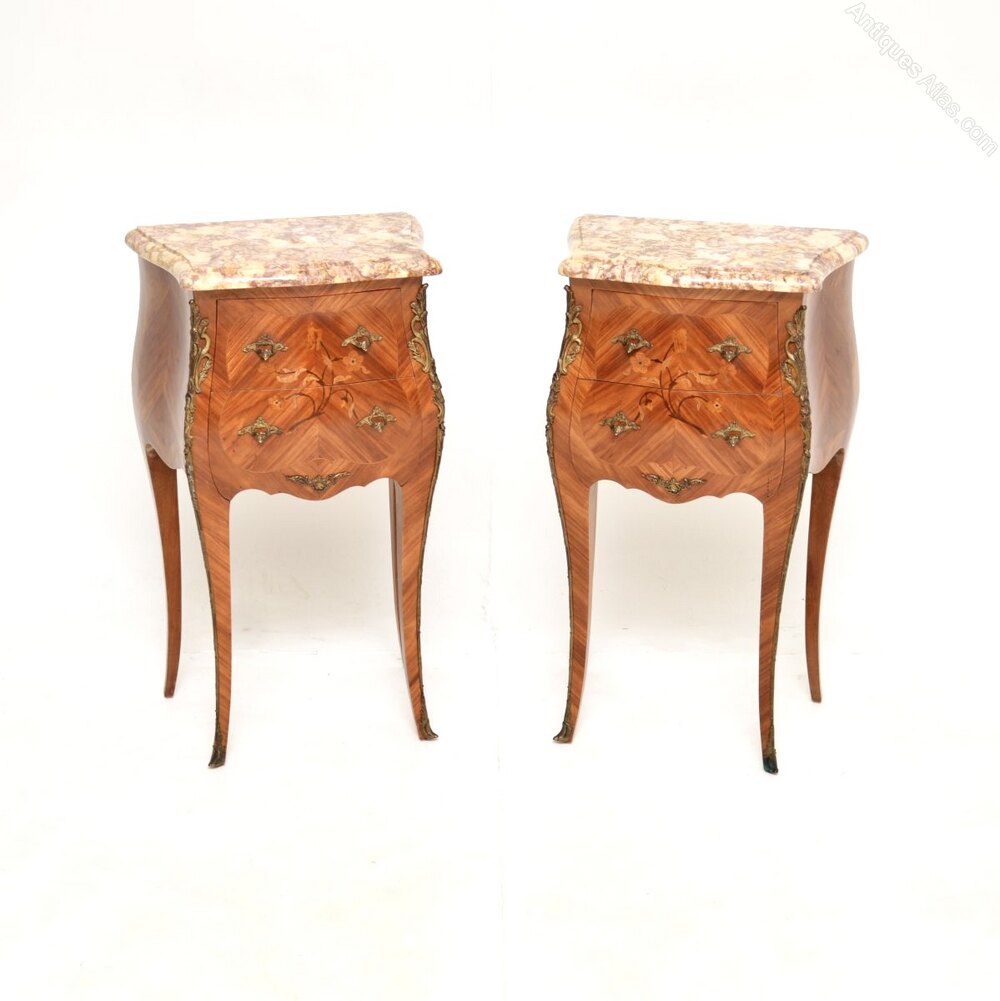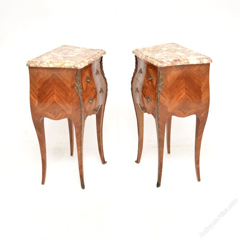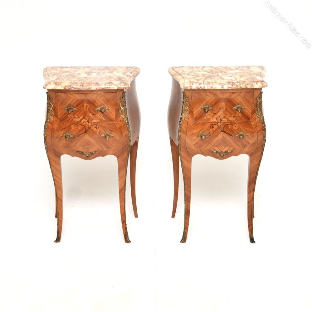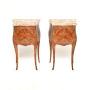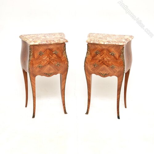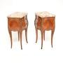 A stunning pair of antique French inlaid marquetry marble top bedside chests. They were made in France and date from around the 1900-1920 period.The quality is fantastic, they have an elegant yet sturdy design. The wood is predominantly king wood, with inlaid marquetry of various other woods. There are high quality ormolu mounts and handles, each has a loose serpentine fronted marble top with gorgeous colouring.