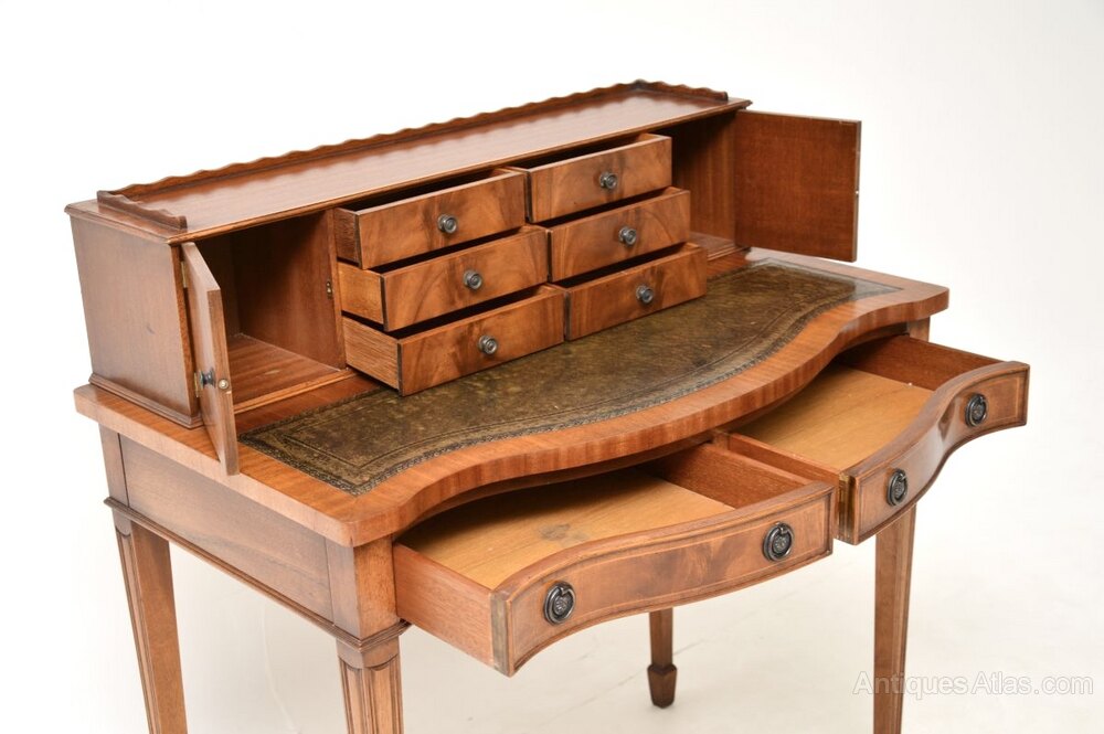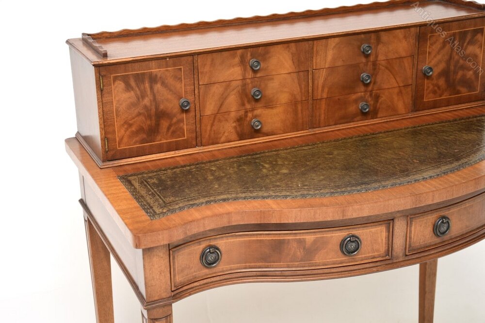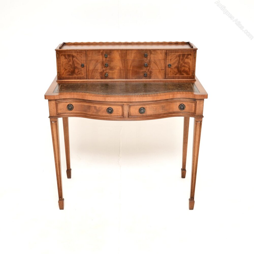 A smart and very well made antique mahogany leather top bonheur du jour writing desk. This was made in England, it dates from around the 1930’s.It is of superb quality and is beautifully constructed from mahogany with fine inlays of satin wood. It has a lovely serpentine shape to the front, there is an inset leather writing surface with nicely tooled edges. There is ample work space and plenty of storage space with two generous drawers under the writing surface, with a further six drawers and two cabinets in the back gallery. The back gallery has a raised pie crust edge, this stands on finely tapered and grooved legs terminating in spade feet. The back is also nicely finished, so can be used as a free standing item.
