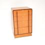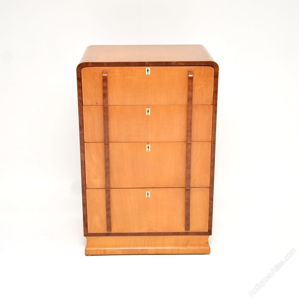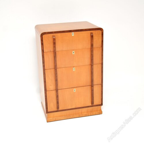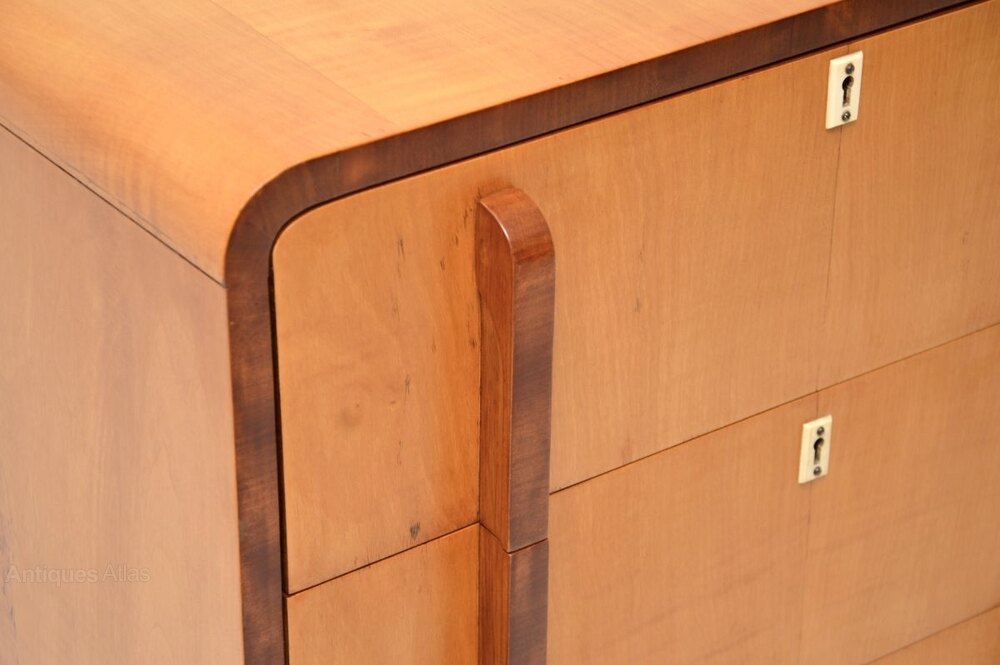 A magnificent art deco sycamore and walnut chest of drawers, this is of the absolute highest order. It was made in England, it dates from the 1930’s.The quality is outstanding, this is beautifully made and has a unique design aspect. It is predominantly sycamore, with walnut banded handles and edges. The top edges are beautifully curved, and this stands on a gorgeous stepped plinth base. The top overhangs slightly at the back, which makes it perfect to sit flush against a wall with skirting at the bottom.