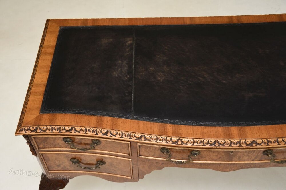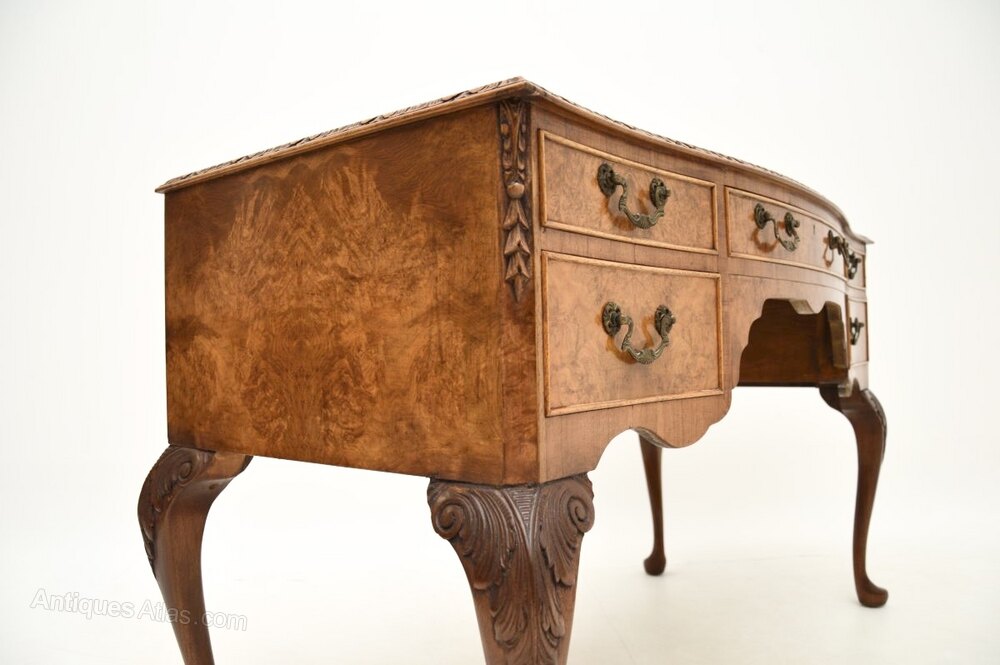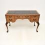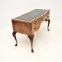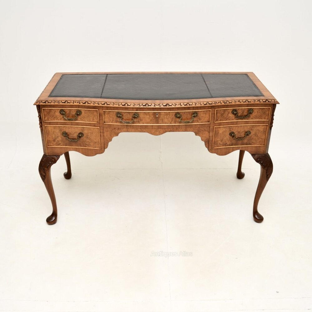 A stunning antique burr walnut leather top desk in the Queen Anne style. This was made in England, it dates from around the 1930’s.It is of superb quality, with beautiful and intricate carving all over the edges and base. This sits on cabriole legs with acanthus leaf carving at the knees, the drawers have lovely etched brass handles. The black inset leather top has tooled edges and this has a nicely finished back, so can be used as a free standing item.