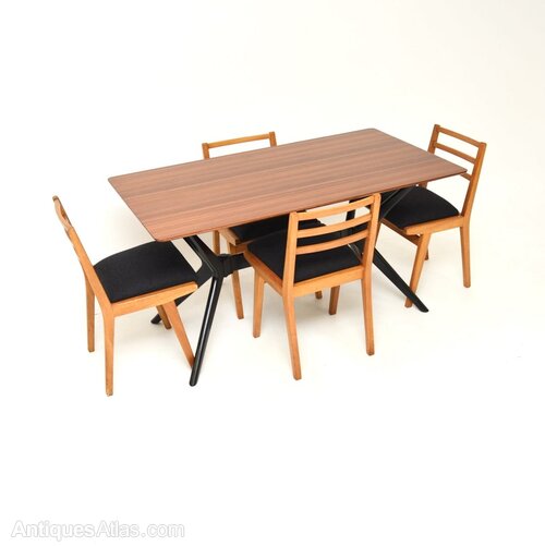 A smart and stylish vintage G Plan Redford dining table and chairs. They were made in England, and date from the 1950’s.The table is sometimes known as the helicopter table due to the design of the base. The top is walnut, the base is ebonised solid wood. The four matching chairs are solid agba wood, and also have a lovely design. This is great quality all round and is a useful, compact size.