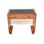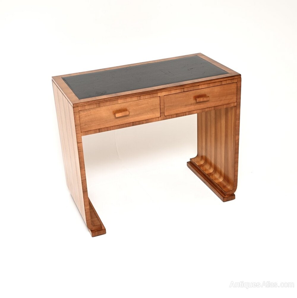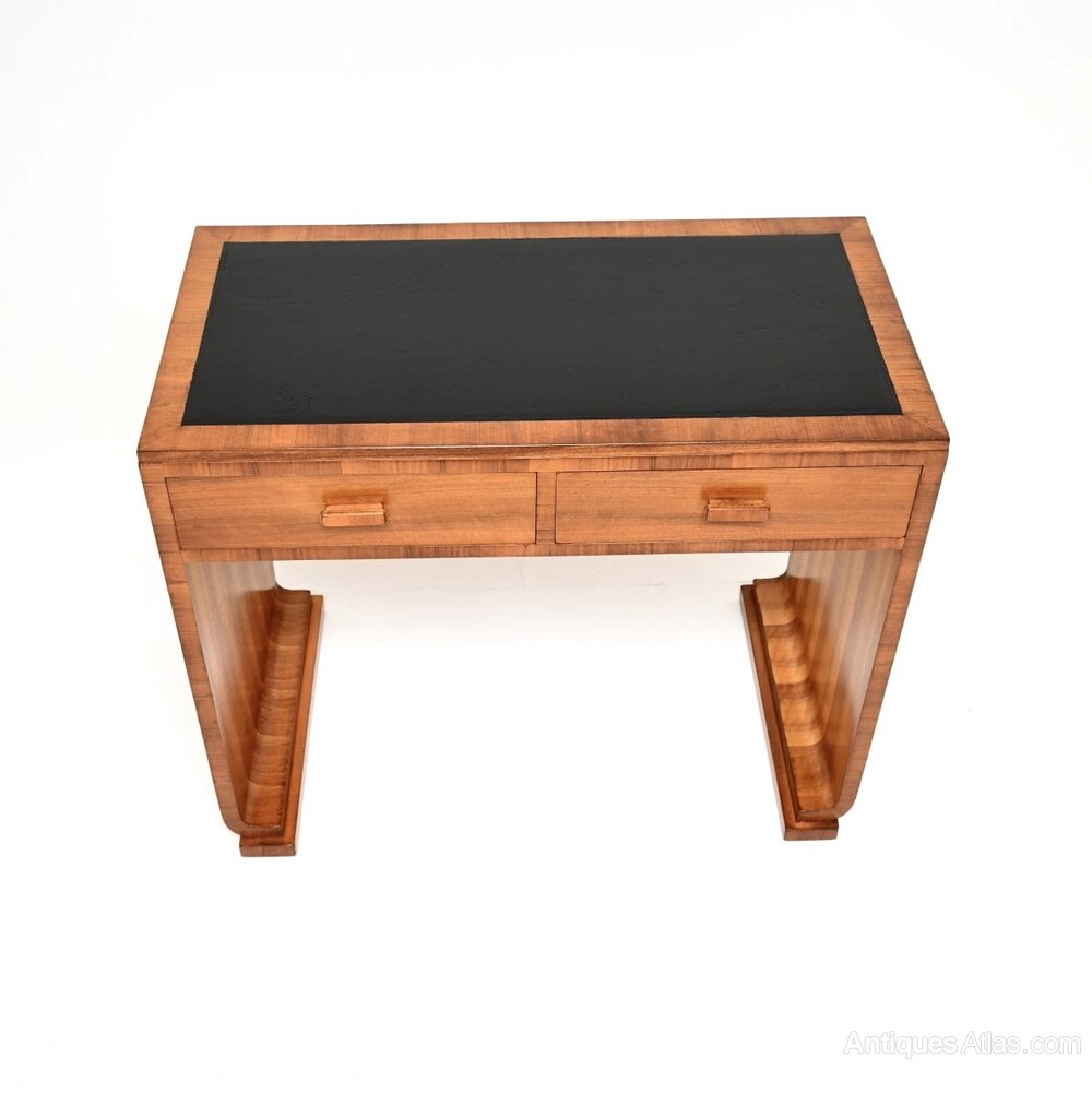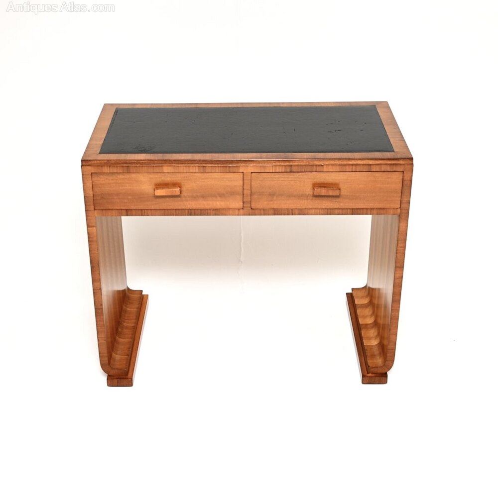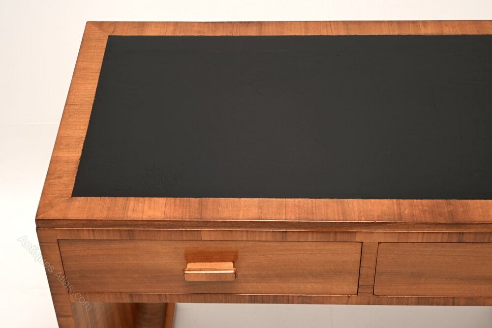 A gorgeous Art Deco walnut leather top desk, made in England and dating from the 1930’s.It is of amazing quality, it is sturdy, very well built and is a very useful size. The walnut grain patterns are beautiful, they are offset beautifully by the inset black leather top. There are two useful drawers, it is beautifully finished on all sides, so it can be used as a free standing item.