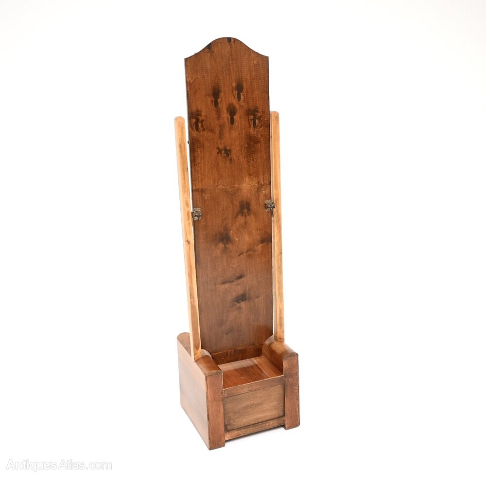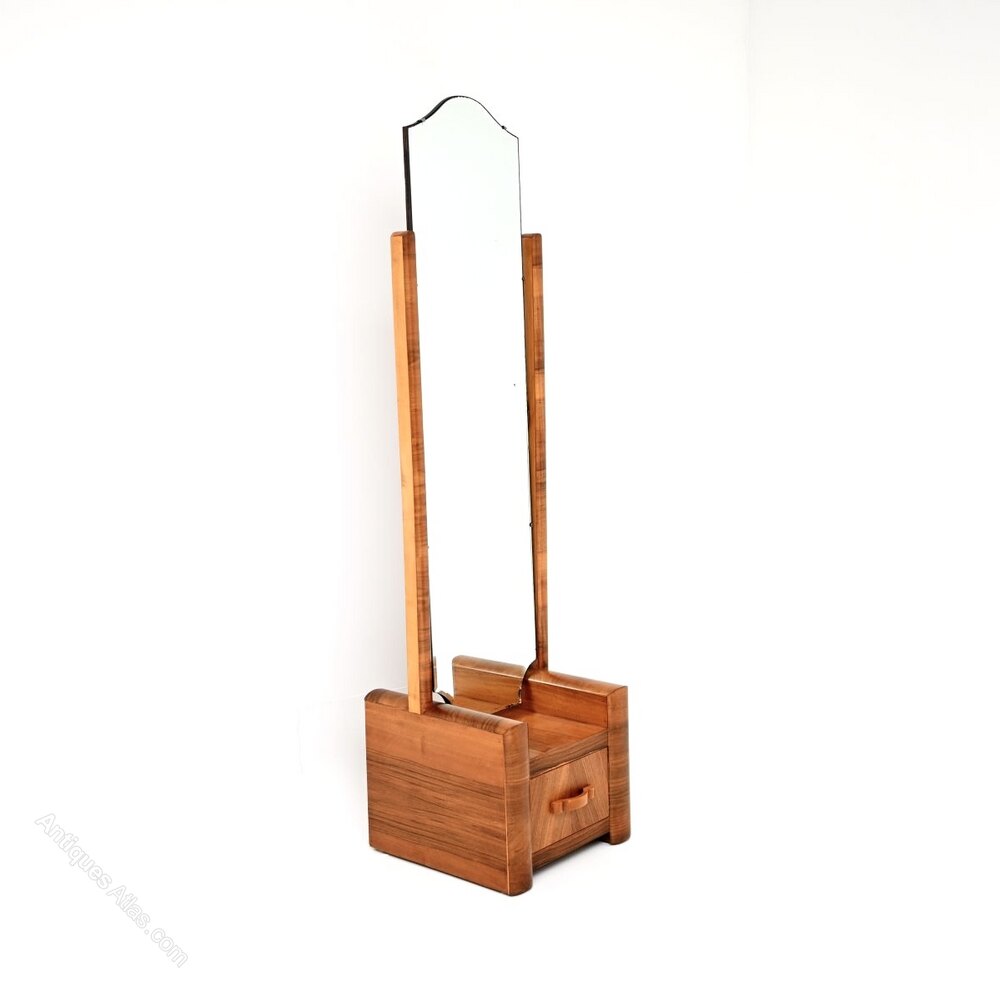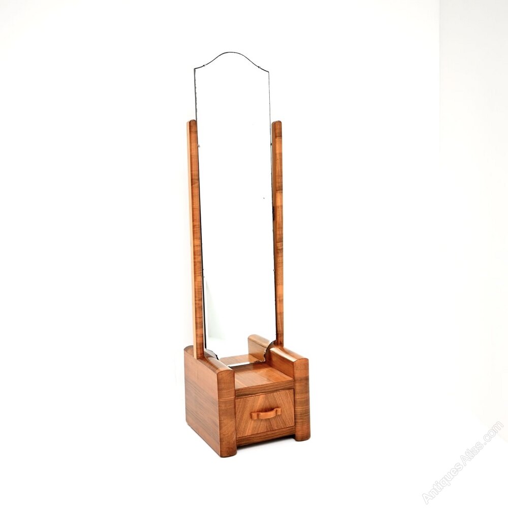A superb original Art Deco figured walnut cheval floor mirror. This was made in England, it dates from the 1930’s.It has a stylish and quite unusual design, the quality is outstanding. The base has a useful single drawer with a beautifully sculpted handle. The mirror can tilt and lift out for ease of transport.